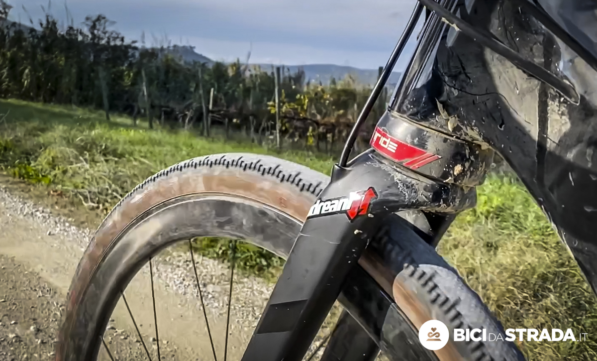 A questo proposito, c’è un altro aspetto degno di nota, forse il più importante in assoluto: la forcella permette di ottenere un ottimo livello di comfort e guidabilità su sconnesso anche senza scendere troppo con la pressione delle gomme (e dunque senza sacrificare la scorrevolezza nei tratti asfaltati o più veloci). In pratica, con questo upgrade si può avere una bici più versatile e performante su una forbice di terreni più ampia.