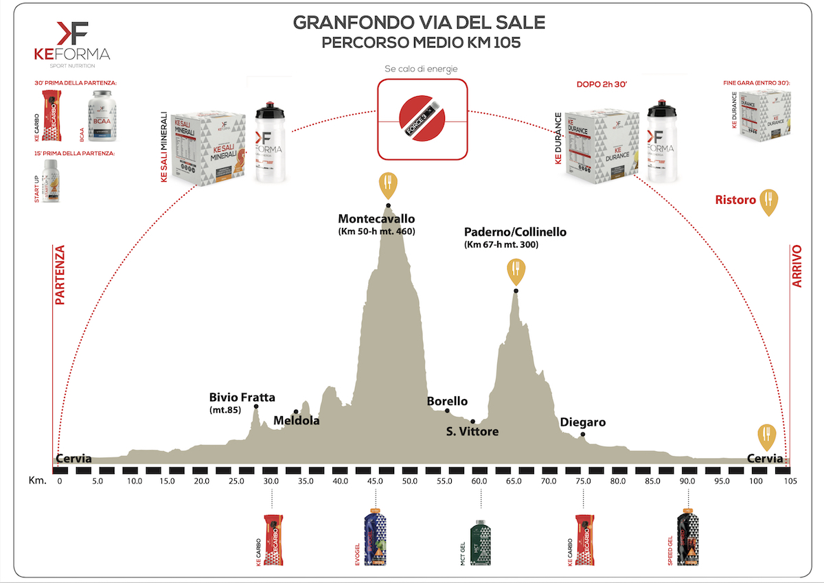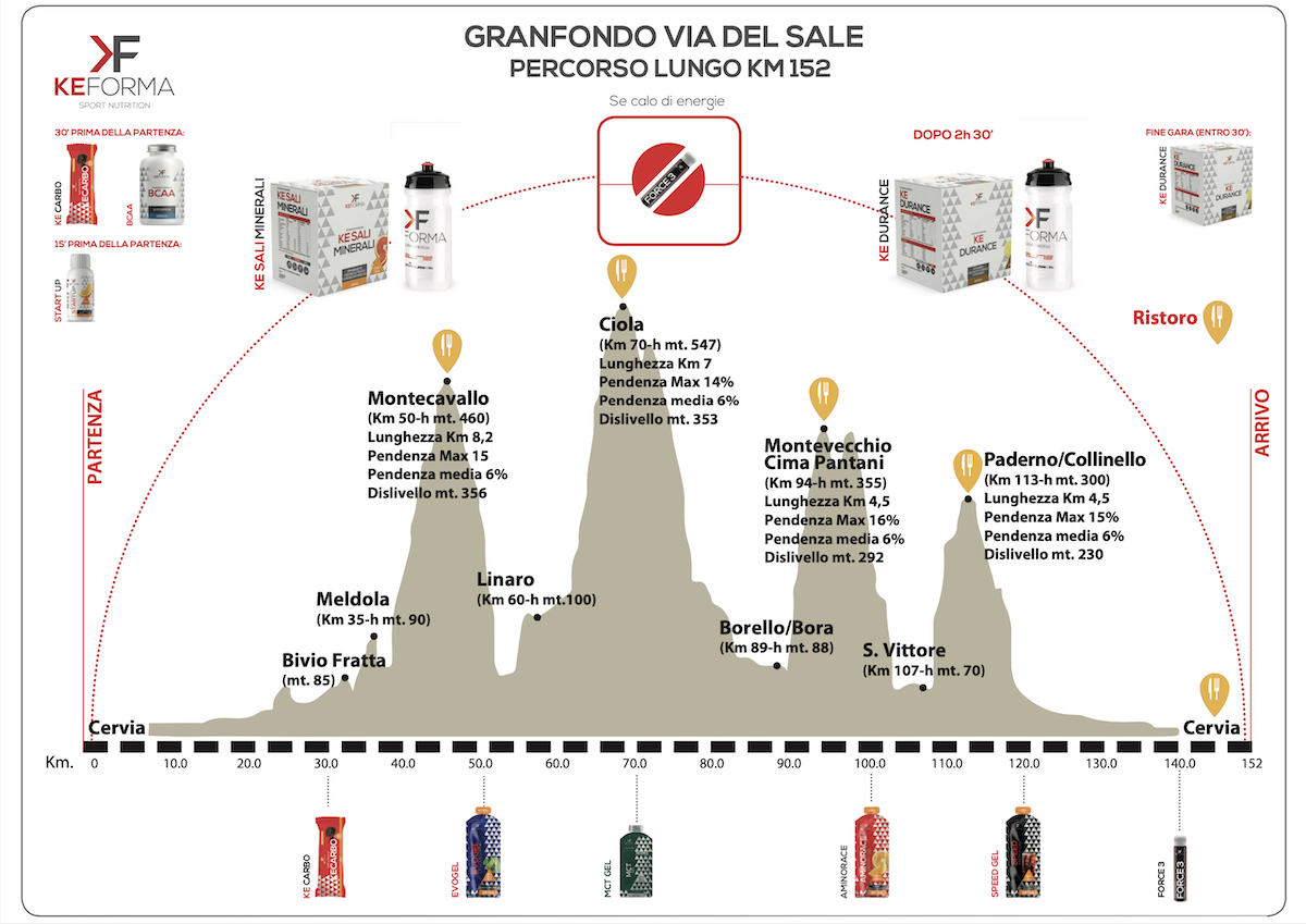 Di seguito trovate due info-grafiche che sintetizzano i consigli di KEFORMA sull’integrazione per la GF Via del Sale, sia sul percorso da 152 chilometri che su quello da 105 chilometri.