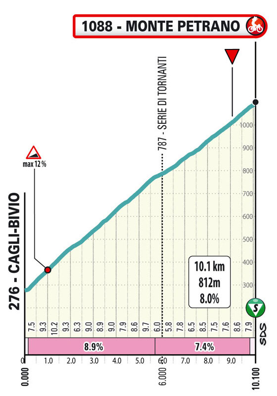 La parte più dura è quella iniziale, con i primi 6 km che sfiorano il 9% medio. Gli ultimi 4 sono invece al 7,4%.