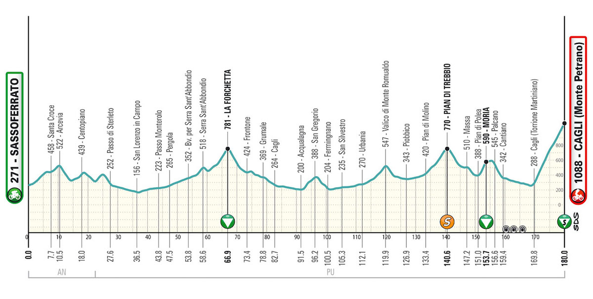 La sesta tappa della Tirreno-Adriatico 2024 non è così dura, ma da Sassoferrato a Cagli la pianura è poca e il dislivello da coprire nei 180 km di gara sarà di 3.100 metri.