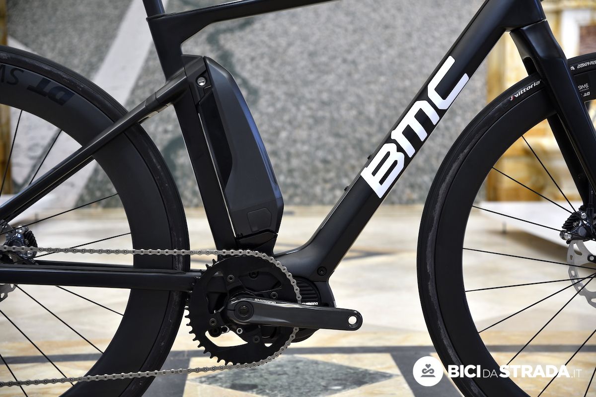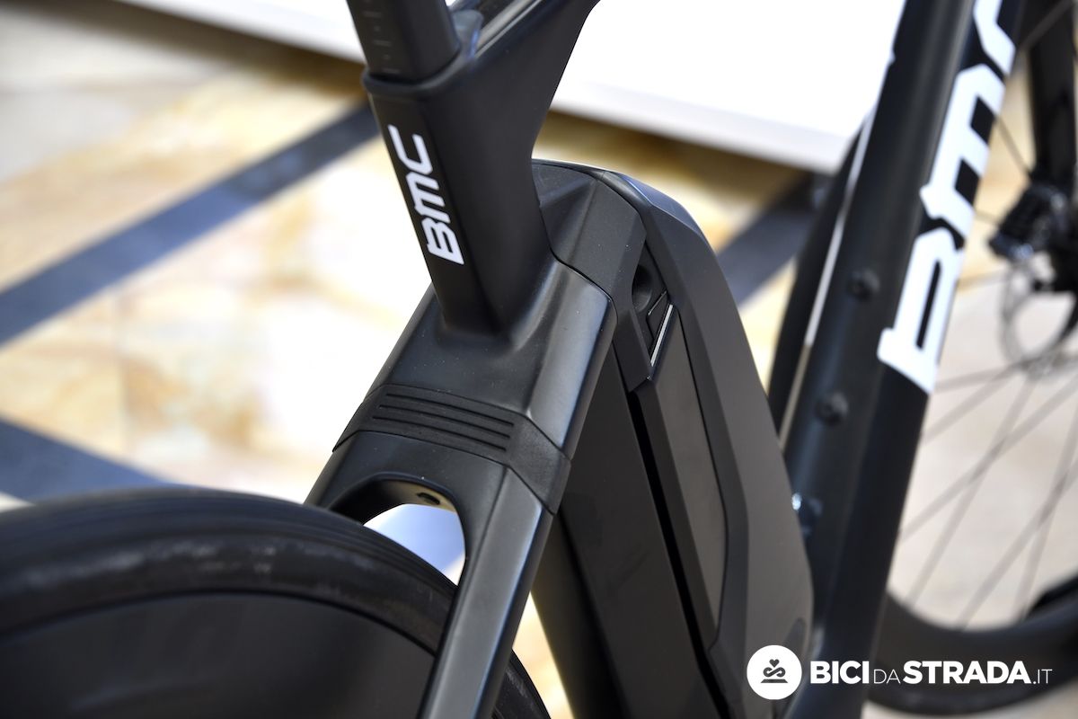 Telaio e forcella sono in carbonio, ma rispetto ad altre e-Road Bike Bmc non ha optato per l'integrazione della batteria nel telaio.