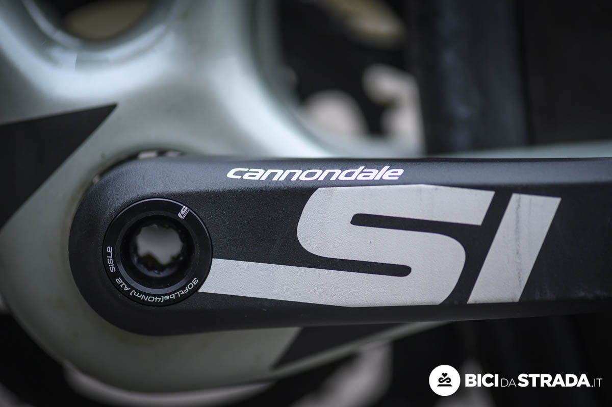 La guarnitura Cannondale SI con corone FSA 50-34 è un “gran bel pezzo” in lega con una forte impronta stilistica del marchio americano e arriva anche a caratterizzare l’estetica della bici.
