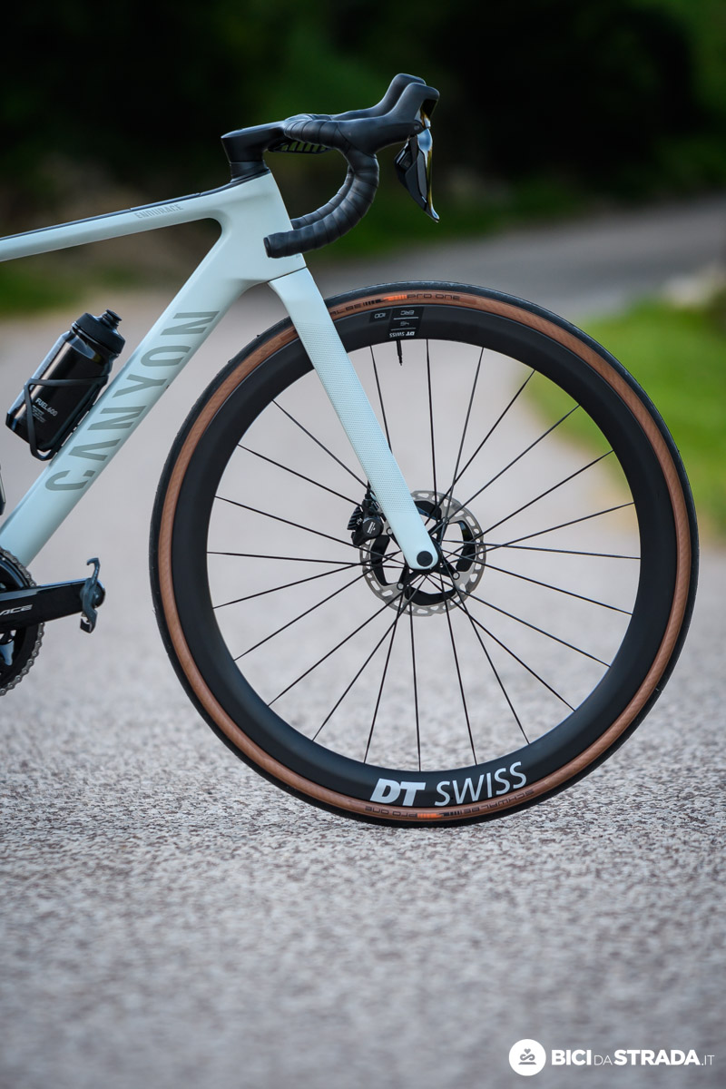 La Endurace CFR allestita con ruote DT Swiss ERC 1100 Dicut. Il canale interno è da 22 mm. Copertura Schwalbe Pro One da 30 mm all'anteriore, 30 mm al posteriore.