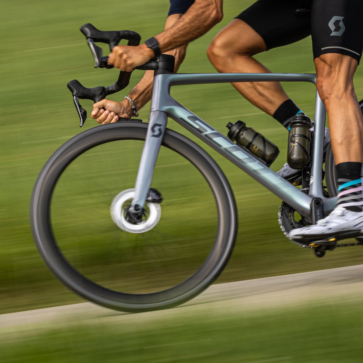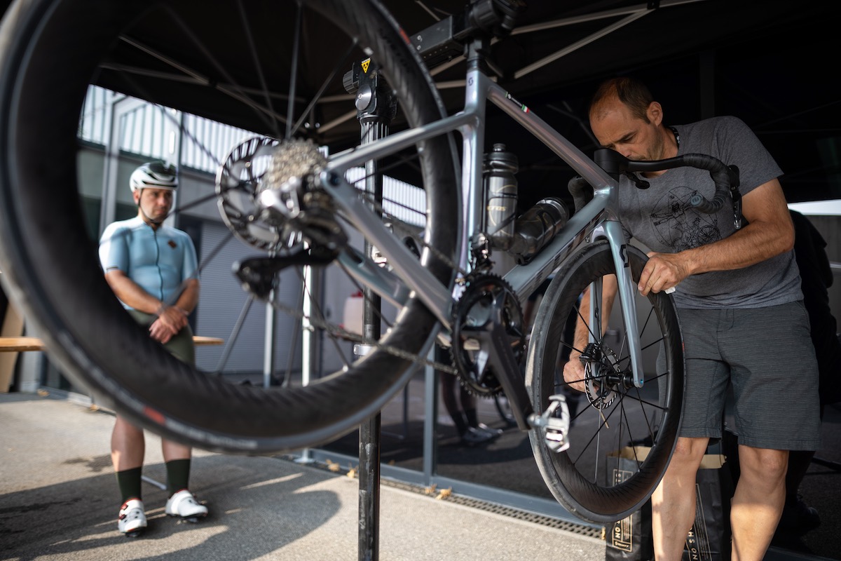 Sullo sfondo le prime applicazioni dei freni a disco sulle bici da strada con i canali interni delle ruote che iniziano ad allargarsi.