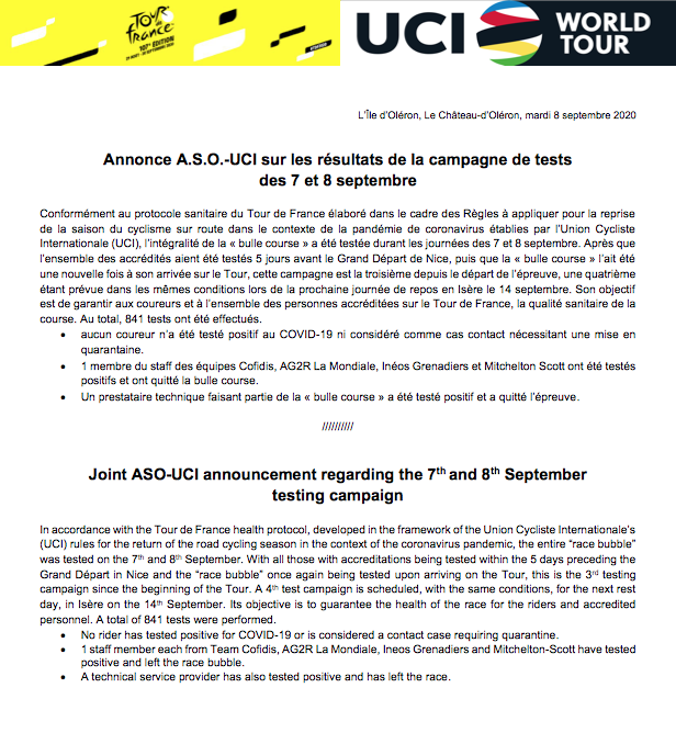 Sono stati resi noti poco fa i risultati dei test sul Covid-19 al Tour de France, svolti ieri durante il giorno di riposo a tutte le 22 squadre (corridori e staff) e a tutto il personale dell’organizzazione, per un totale di 841 test.