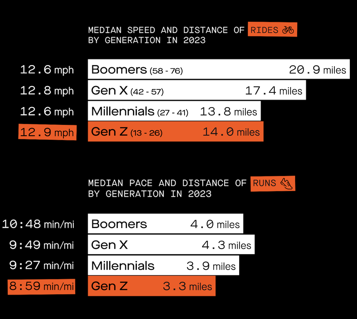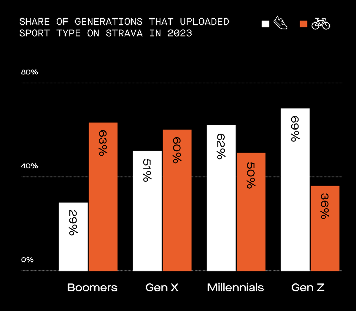 Il report con i dati Strava 2023 ha anche spacchettato le abitudini per classe d’età, suddividendo gli utenti in 4 gruppi: Gen Z (13-26 anni), Millenials (27-41), Gen X (42-57) e Boomers (58-76).