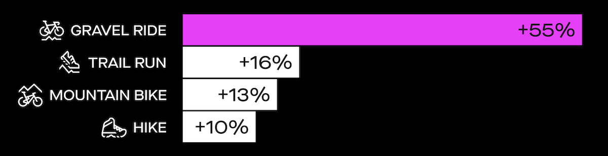 Per quanto riguarda le due ruote, sorprende solo fino ad un certo punto la crescita esponenziale del gravel: si tratta dell’attività in più rapida crescita su Strava (e non solo, aggiungiamo noi…), con un aumento del 55% nella percentuale di praticanti.