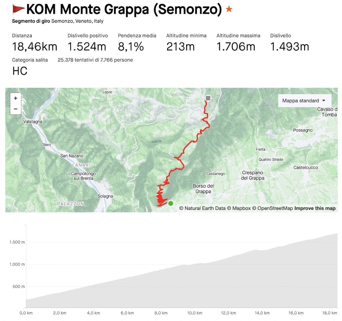Una salita che è patrimonio culturale e sportivo: strada Generale Giardino, SP 140, meglio conosciuta come l'ascesa al Monte Grappa da Semonzo (VI). 18,4 km al'8,1%. Il secondo versante più frequentato dai ciclisti dopo la strada Cadorna che si imbocca da Romano d'Ezzelino (26,4 km al 5,9%). Un luogo consegnato all'epica del ciclismo grazie all'impresa di Tadej Pogačar all'ultimo Giro d'Italia. Riceviamo e pubblichiamo volentieri questo diario di un ciclista, scritto da Giampiero, un lettore di Bicidastrada.it. C'è il fascino della salita, senza cronometro, senza misuratore di potenza. C'è il caldo come unico avversario e la voglia di arrivare su per guardare giù e approcciare il mondo da un'altra prospettiva.