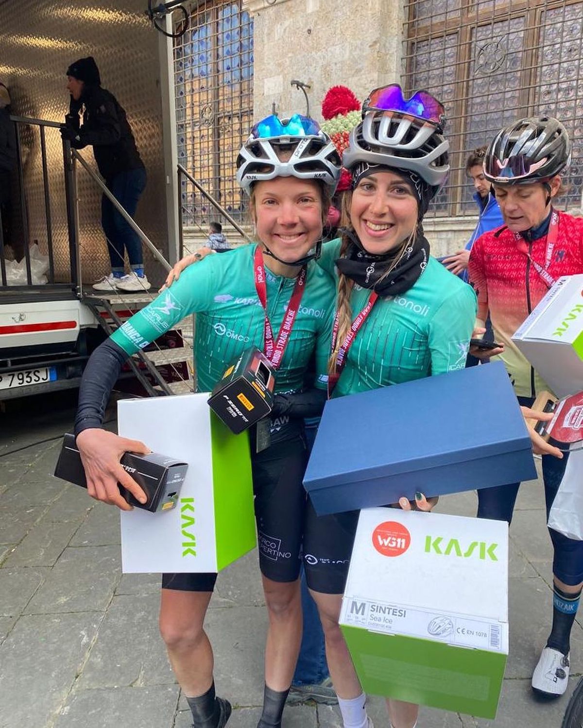Maria Cristina Prati (al centro) è un nome storico delle granfondo al femminile ed è l'attuale Campionessa del Mondo a cronometro cat. Master Woman 55–59 anni. Foto: gentile concessione Maria Cristina Prati.