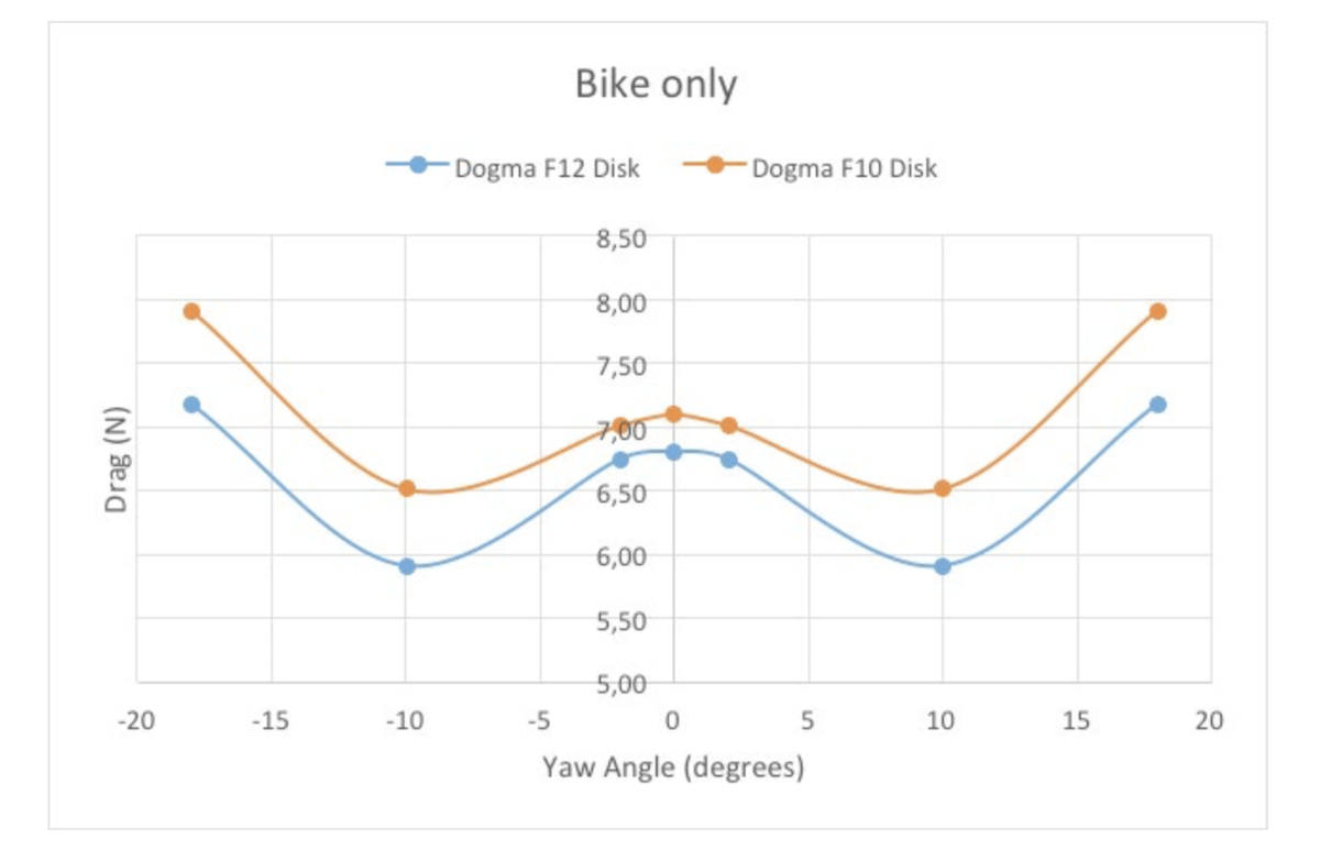 Su telaio e forcella Dogma F12 sono stati apportati numerosi piccoli miglioramenti per garantire un vantaggio aerodinamico che ha portato ad una riduzione della resistenza all’aria del 7,3% e un risparmio di 8 Watt a 40 km/h, rispetto alla precedente Dogma F10.