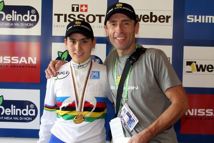 Valentina Laura Abril con la maglia di campionessa mondiale nel 2008, insieme ad Andrea Bianco, tecnico della Nazionale Colombiana Mtb dal 2003 al 2015 e parte del gruppo di AFB Cycling Academy insieme ad Alberati e Fondriest