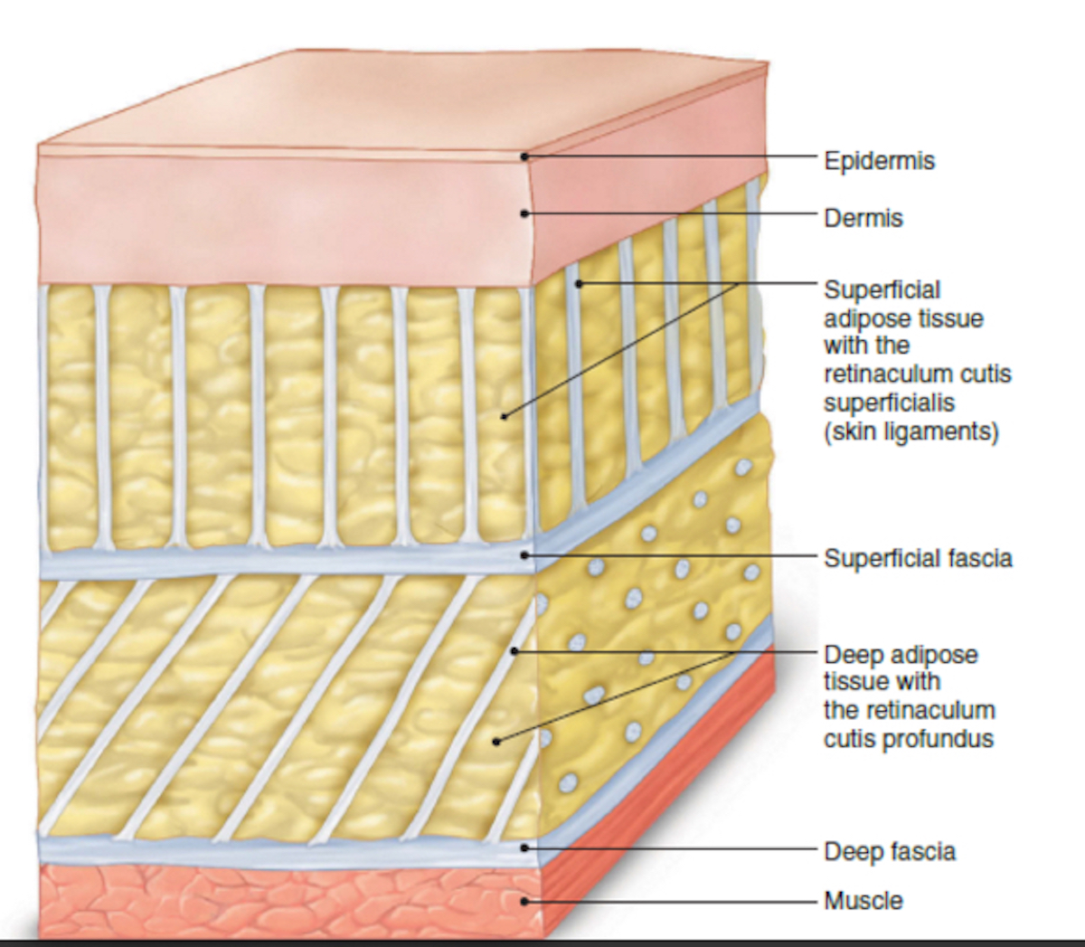 Il sistema fasciale. Sono evidenti di due strati che si interpongono tra cute e muscolo. Fonte: themedicalalphabet.wordpress.com