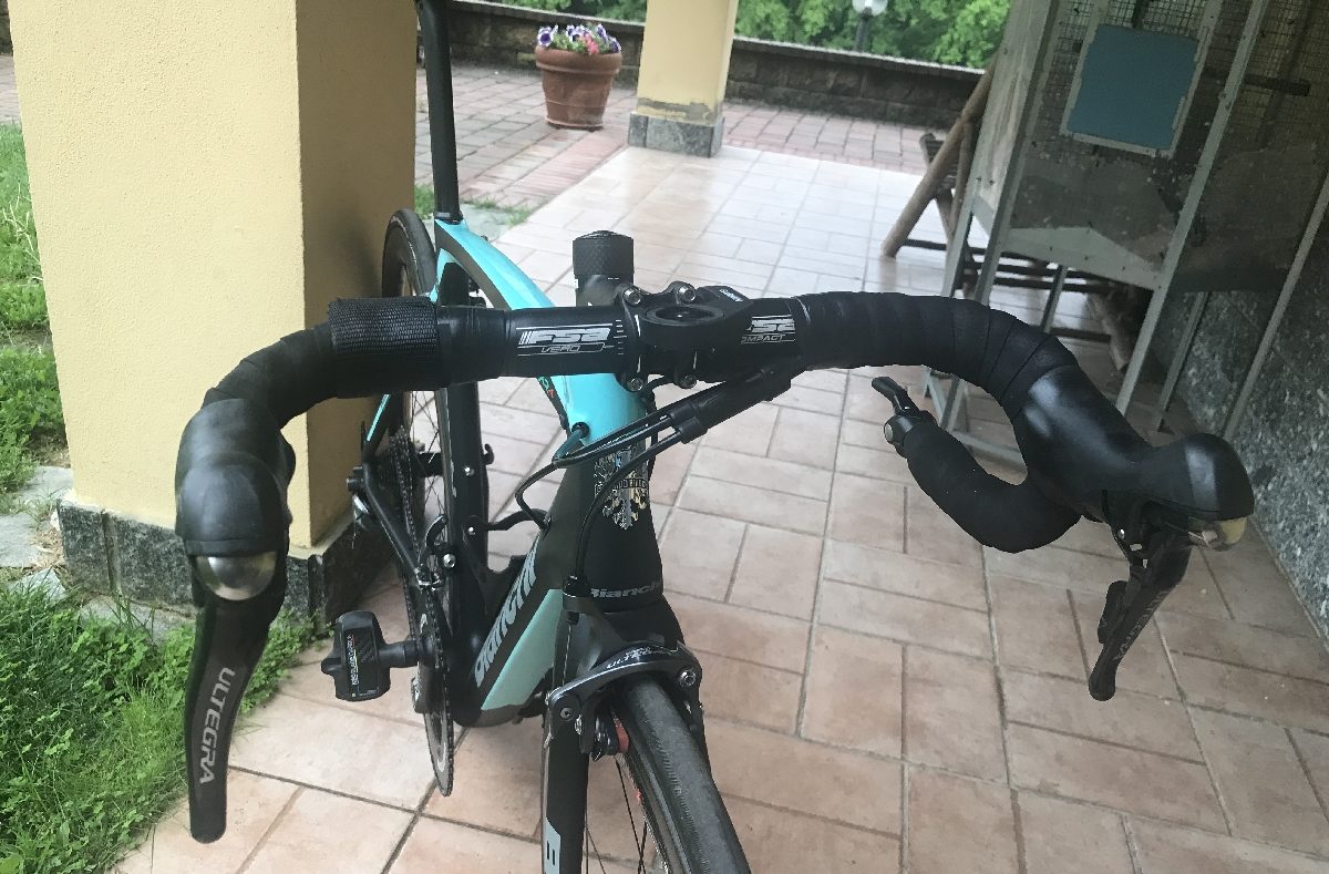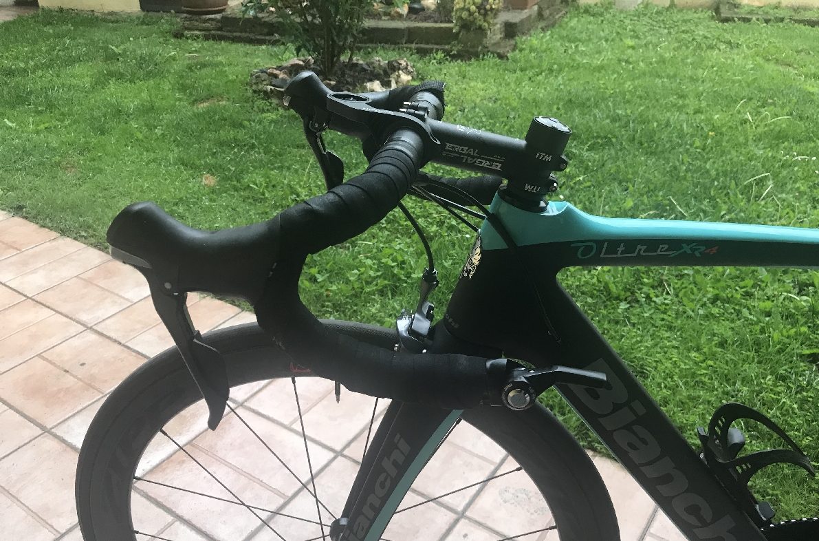 La bici "modificata" di Roberto, con tutti i comandi e i freni sul lato sinistro del manubrio.