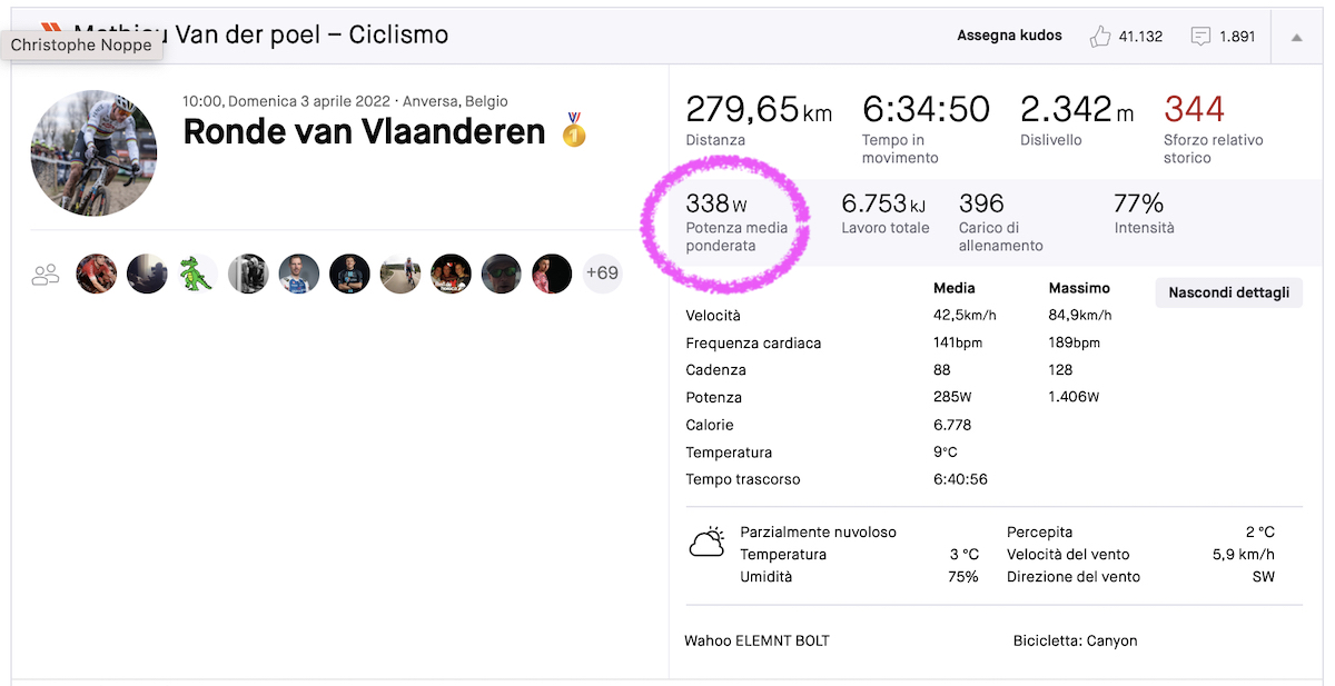 Anche se Van der Poel non è un peso piuma (circa 75 kg), si tratta comunque di un valore straordinario se parametrato alle oltre 6:30’ di gara.