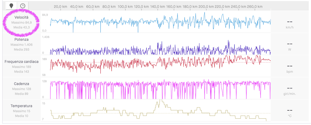 Il file di Van der Poel ci mostra una media di 42,5 km/h su 6:34:50 di gara, ma comprende anche i primi 7 km ad andatura controllata. Se li togliamo la media sale a 43,3 km/h.