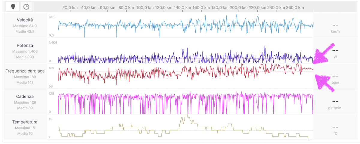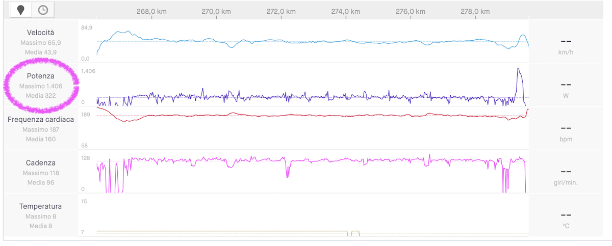Detto questo, dai dati si può osservare come avesse ancora una grande gamba, perché in accelerazione ha espresso una potenza massima di 1.406 watt (dopo 6 ore 30’!), con una media sui 10” di 1.216 watt.