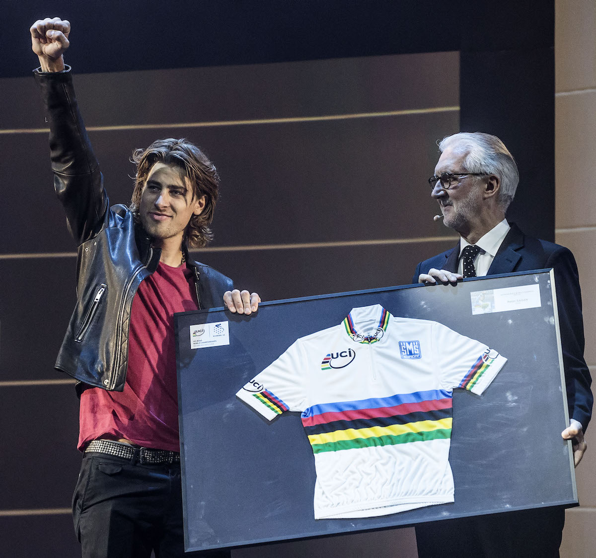 Sagan versione rockstar al Cycling Gala UCI 2015 ad Abu Dhabi. Assieme a lui il presidente Brian Cookson. Foto: Ansa/Angelo Carconi