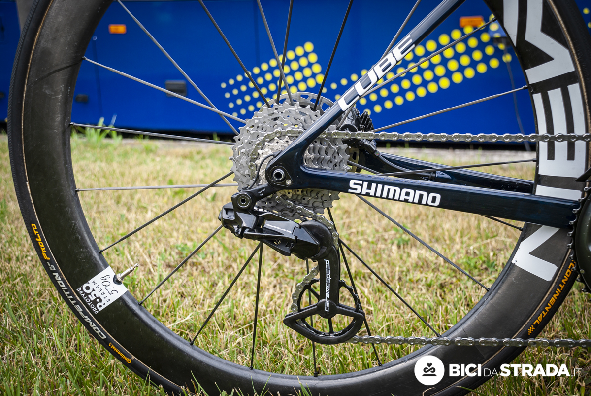 Da notare che la Cube prototipo di Pozzovivo utilizza la "vecchia" guarnitura Shimano Dura-Ace serie 9100, unico componente della serie precedente del marchio nipponico. Sul manubrio non sono presenti i pulsanti satellite.