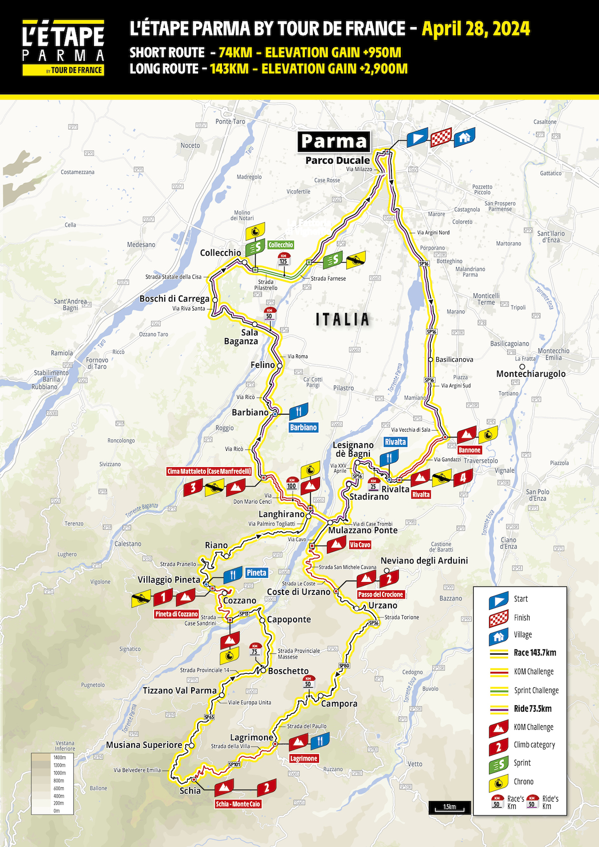 • Il 27 aprile, presso il Parco Ducale, aprirà il Villaggio Parma che offrirà un'area Expo, un Outlet Priveè dei grandi marchi del ciclismo, un'officina meccanica e un'area pump track. Sarà anche inaugurata la Mostra Museo del Tour de France, insieme a un evento al Teatro al Parco in collaborazione con il Museo Digitale Diffuso del Ciclismo italiano.