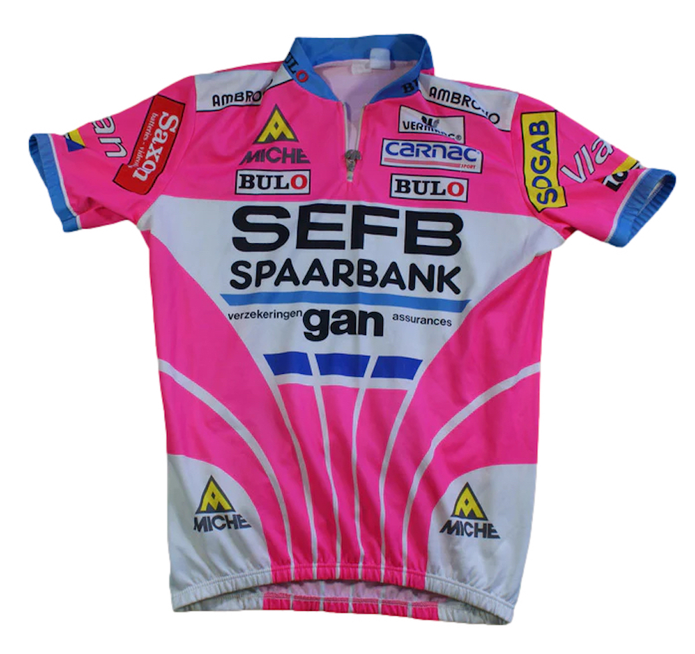 - Esattamente! Stiamo lavorando per scrollarci di dosso questa etichetta grazie ad una nuova immagine e ad una sostanza tecnica che non è mai mancata. Ad esempio, non tutti sanno che tra il 1990 e il 1991 l'azienda ha fornito addirittura il gruppo trasmissione alla squadra belga S.E.F.B.-Saxon-Gan (nella foto sotto la maglia, n.d.r.). Nel 1994 abbiamo prodotto Primato, uno dei primi ingranaggi carenati al mondo, con dentature piuttosto particolari per l'epoca: 60, 61, 62, 63 e 64T. Soluzioni dedicate a Francesco Moser e al suo ultimo tentativo di Record dell'Ora poi non andato a buon fine (foto sotto n.d.r.). L'accordo triennale tra Miche e Groupama-FDJ intende collocare il marchio in un immaginario d'eccellenza facendo leva sopratutto sulle ruote.