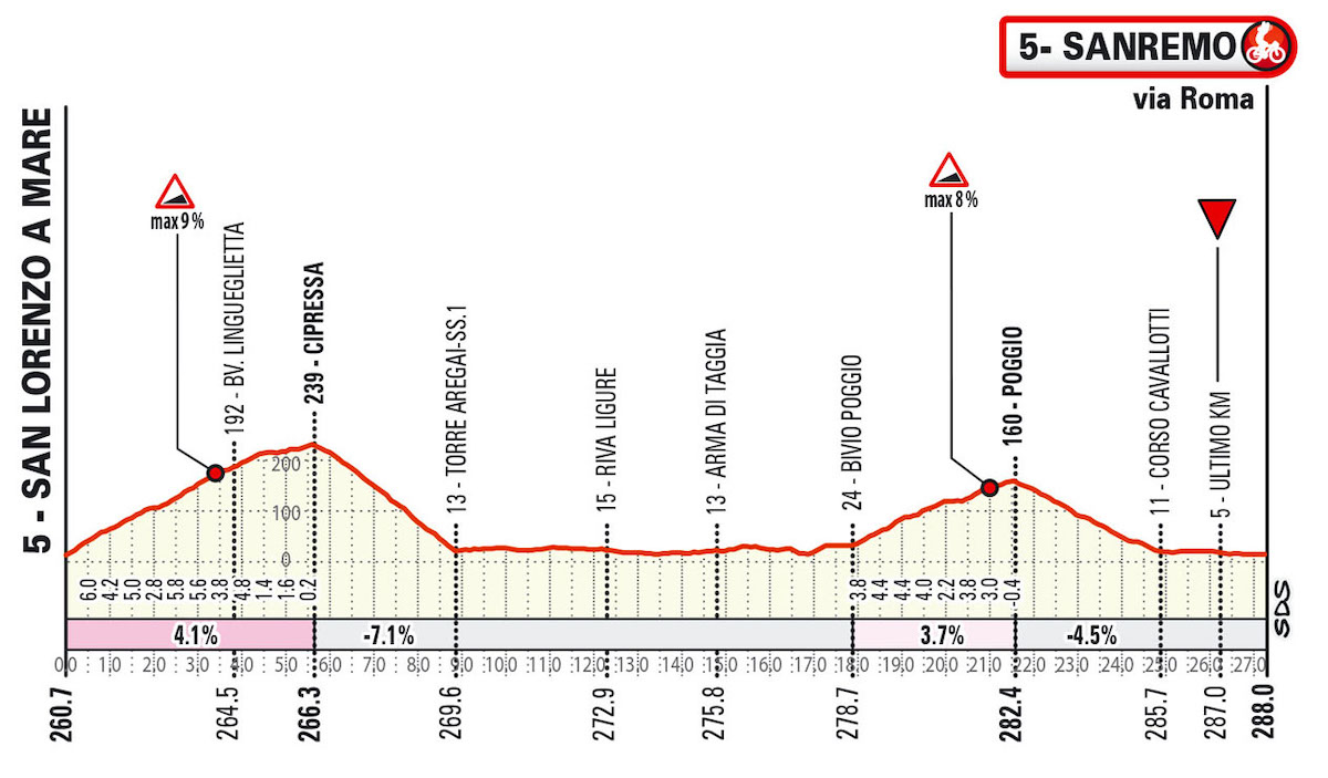 Al km 278,7 (9,3 km all'arrivo) i corridori svolteranno a destra per imboccare un'ascesa che dal 1960 contraddistingue la Milano-Sanremo: il Poggio. 3,7 km al 3,7%.
