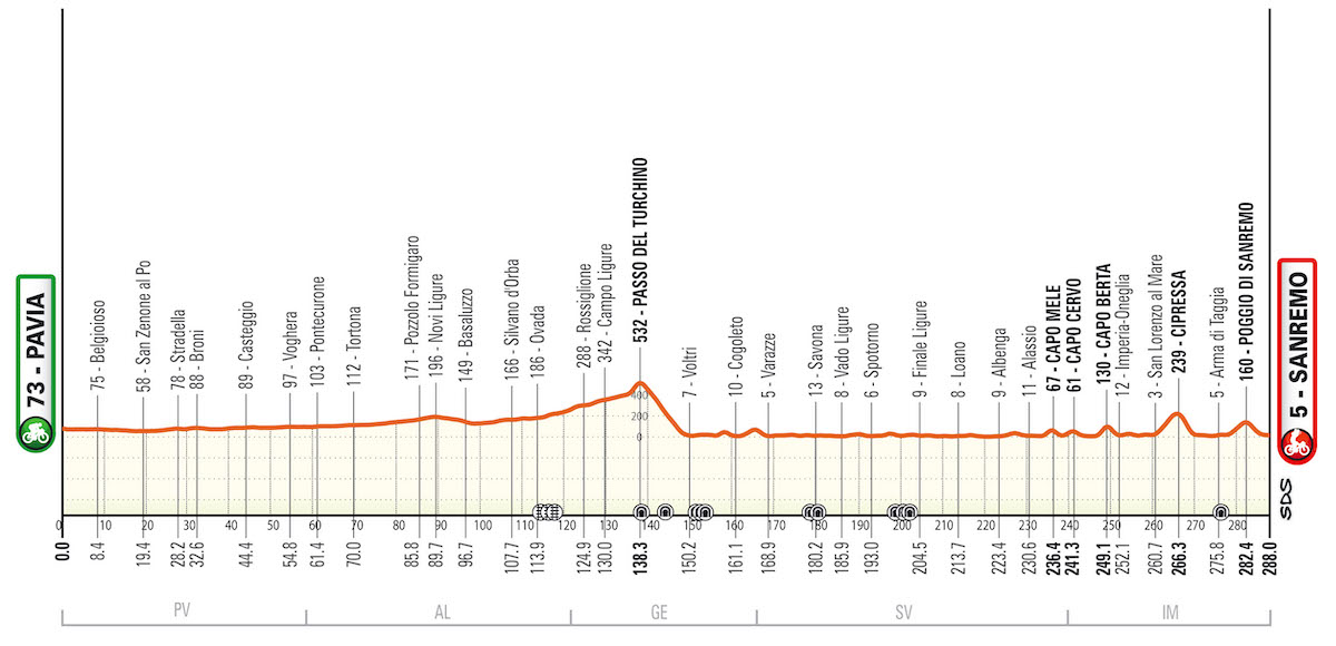 La 115° Milano-Sanremo scatterà sabato 16 marzo alle ore 10:00 dal Villaggio di Partenza di Pavia. Il via ufficiale (km 0) è previsto per le ore 10:15 dopo 5,7 km di trasferimento.