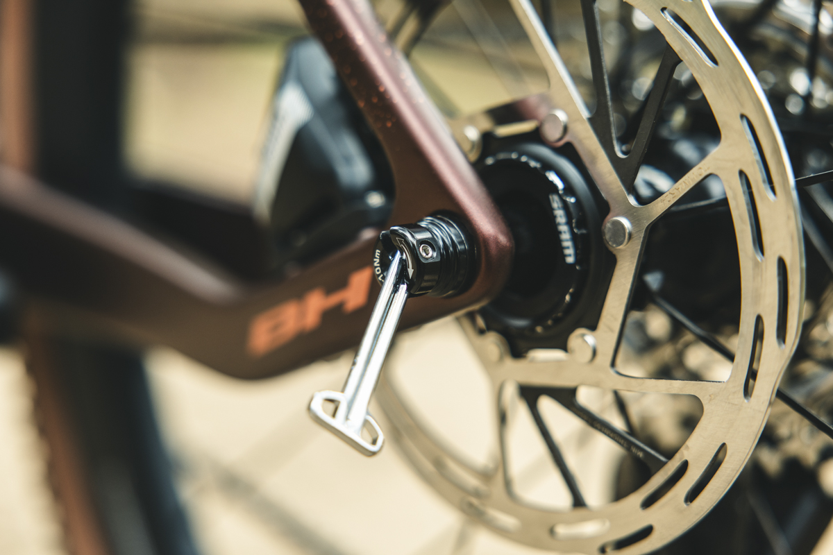 Sia il telaio che la forcella, come da consuetudine BH, dispongono delle hidden quick levers, che integrano le leve di apertura nel corpo del perno e permettono di svitare i perni stessi senza l’ausilio di chiavi. Sul lato destro, invece, telaio e forcella sono completamente chiusi, nascondendo i perni per motivazioni estetiche e aerodinamiche.