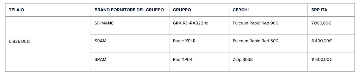 Si tratta di una piattaforma unica declinata in tre versioni, che hanno caratteristiche diverse ma alcuni denominatori comuni, come l’attenzione al design, il telaio in carbonio modulare (non monoscocca) e la produzione Made in Italy.