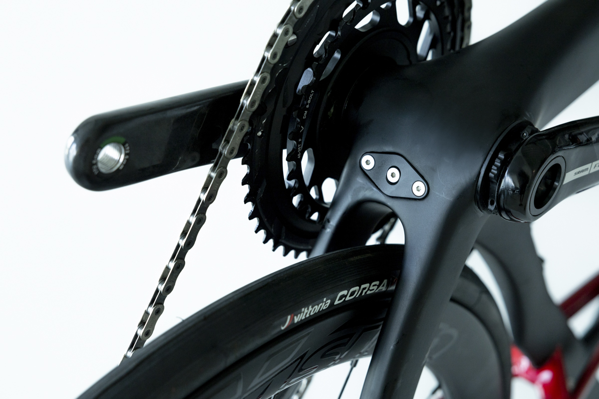 In questo caso i foderi alti del carro si collegano direttamente al tubo orizzontale, formando, appunto, due canali. Questa soluzione, come sulla Madone, dovrebbe ridurre le turbolenze in una zona critica del telaio e migliorare dunque le prestazioni aerodinamiche.