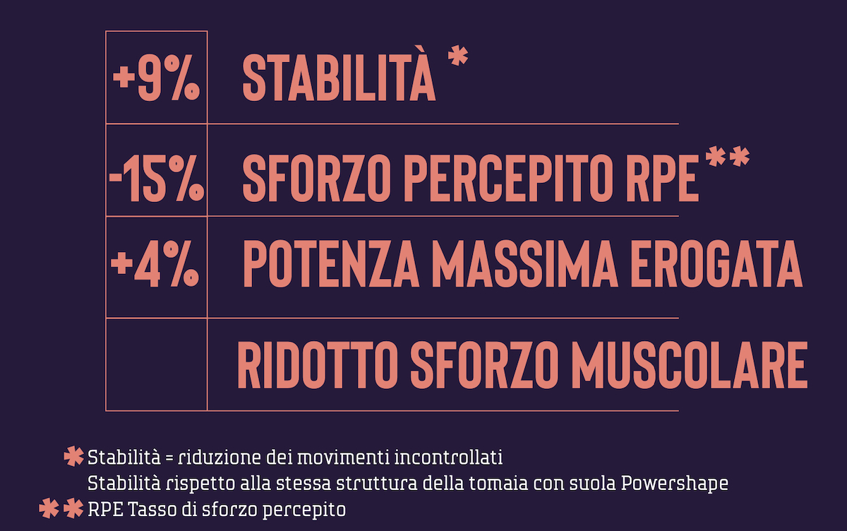 Parlando di numeri, secondo quanto dichiarato da Northwave rispetto alla suola Powershape, Powershape HT aumenta del 9% la stabilità, riduce del 15% lo sforzo percepito (misurato attraverso il tasso RPE, “Rate of Perceived Exertion”) e accresce del 4% la potenza massima erogata.