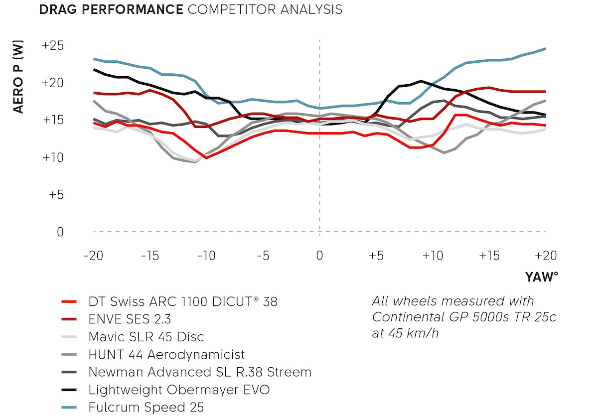 DT Swiss ha messo poi a confronto le ARC 1100 DICUT 38 con diverse ruote rivali della medesima categoria.