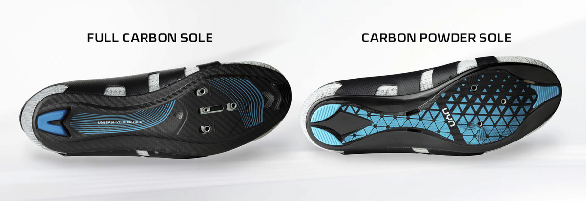 Il modello UYN Naked Full-Carbon presenta invece una suola costituita da sette fogli di carbonio, eccezionalmente rigida ed ultra leggera (il peso complessivo della scarpa nella taglia di riferimento è di 230 grammi).