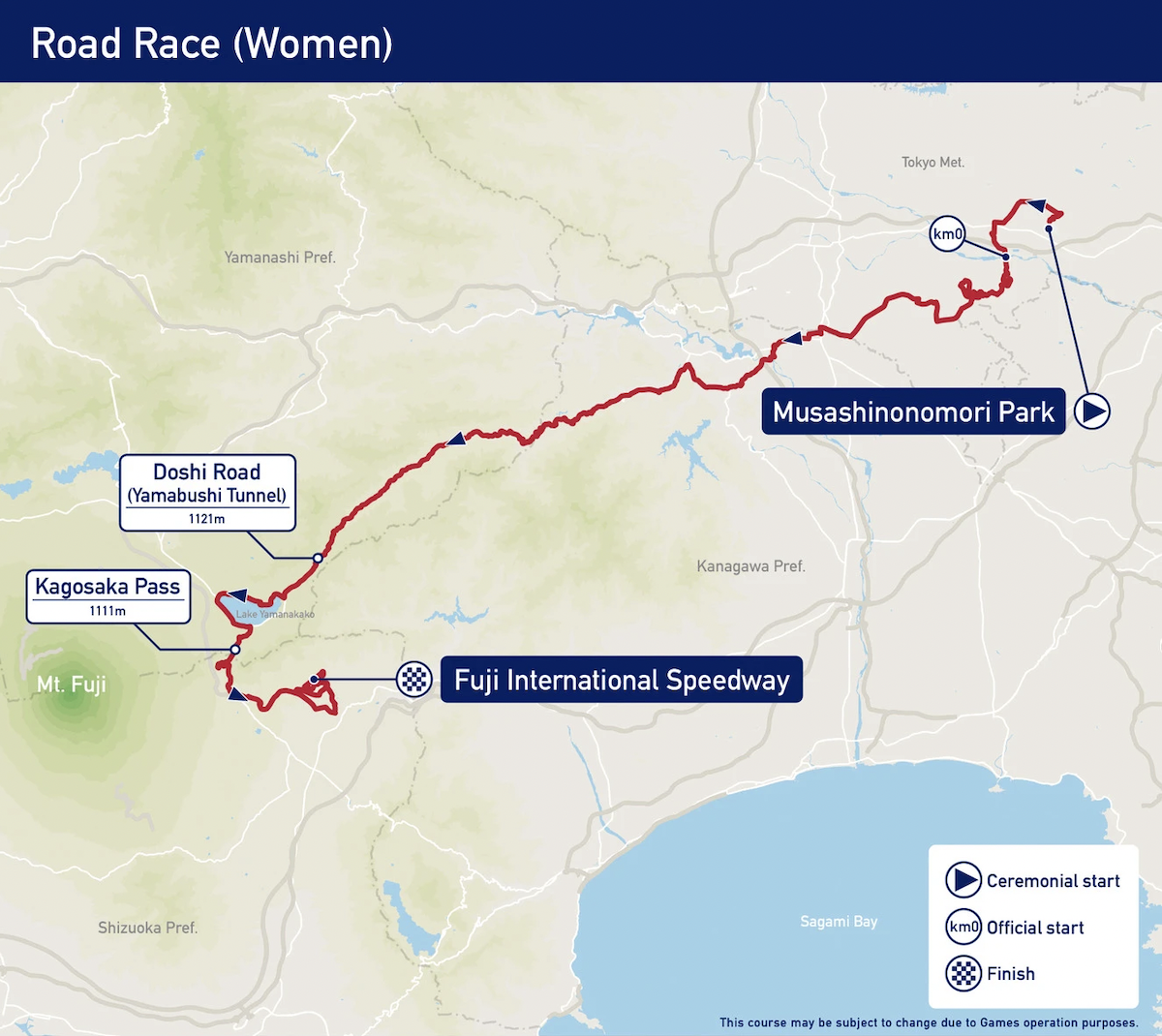 Il percorso ricalca quello maschile, ma sarà privo delle salite al Monte Fuji e al Mikuni Pass.