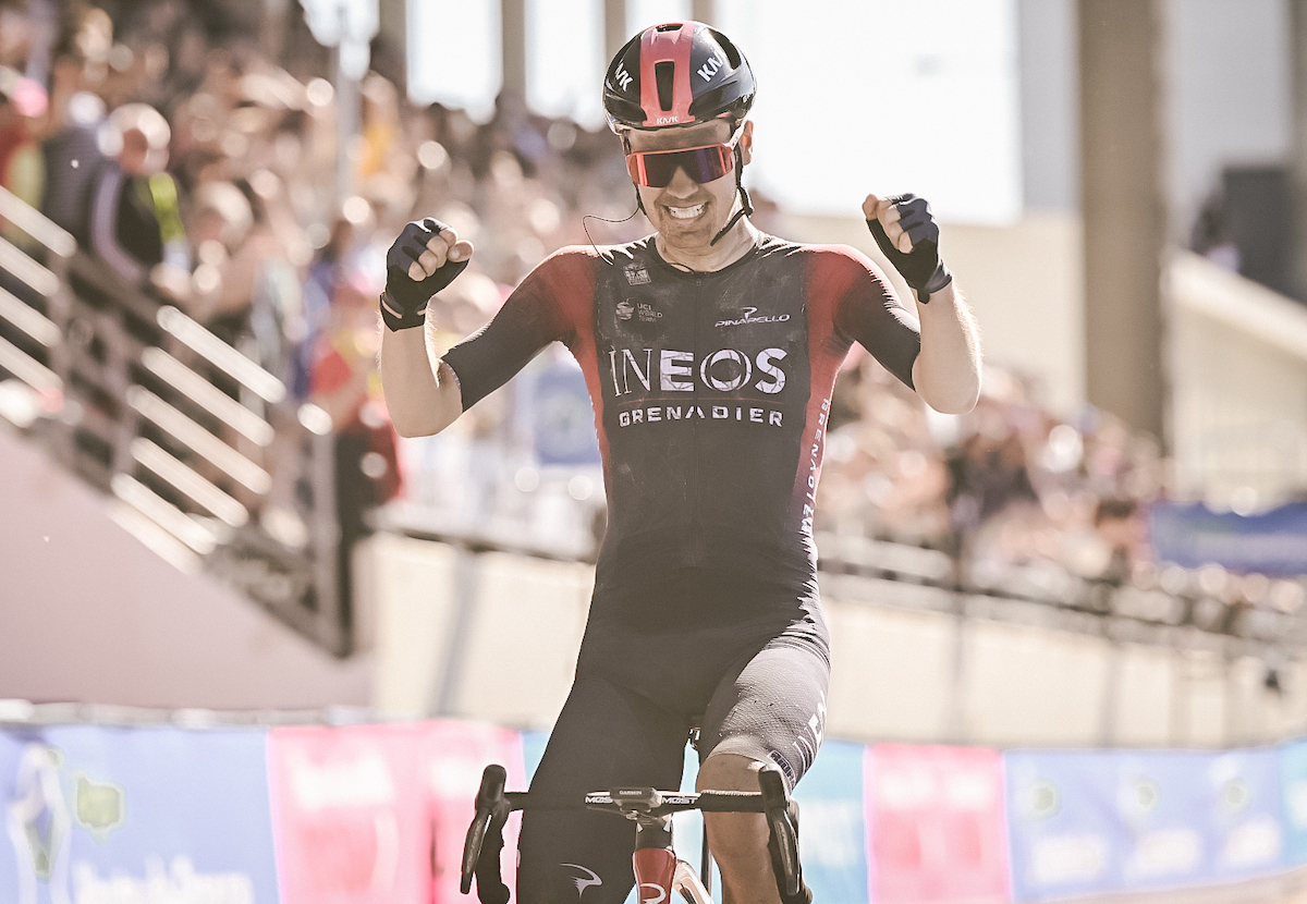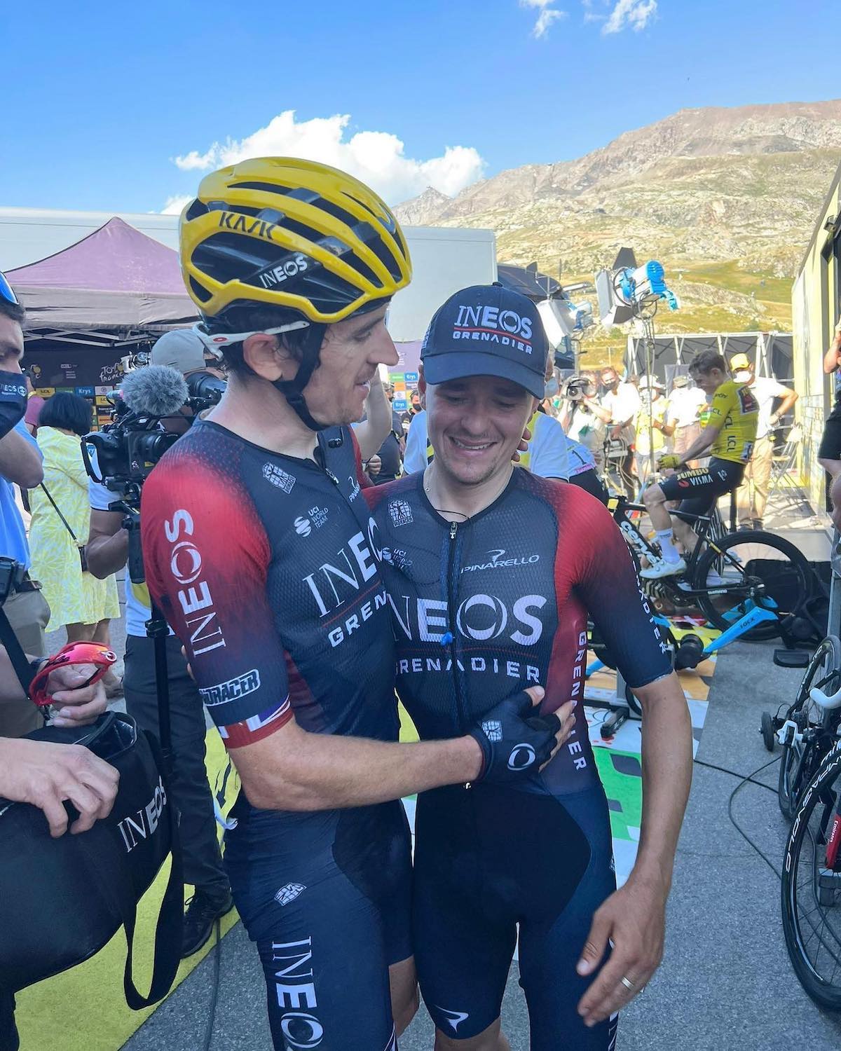 Pochi minuti dopo l'arrivo vittorioso sull'Alpe d'Huez. Pidcock riceve i complimenti da Thomas. I due non hanno usato capi con la struttura a ragnatela. Foto: @INEOSGrenadiers
