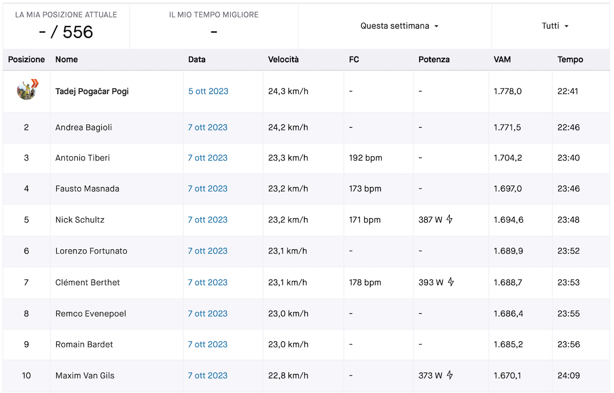 Non è il KOM solo perché il tempo record è stato fatto registrare dallo stesso Pogačar nella ricognizione del venerdì con 1 secondo in meno, ma in condizioni ottimali e non dopo 200 km di gara tirati.