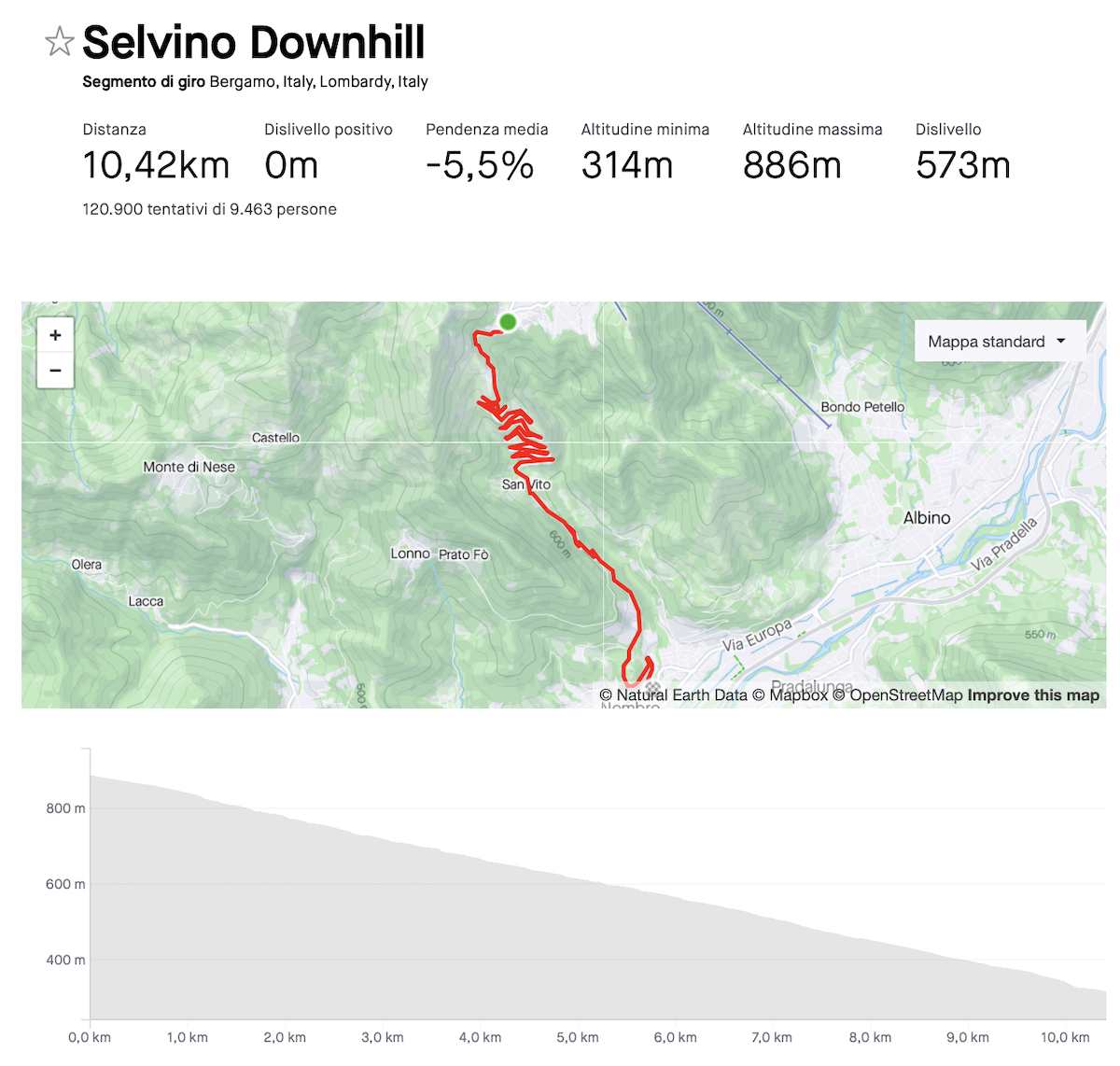 I numeri rivelano un tempo record sul segmento Selvino Downhill: 11:07", con una velocità media di 56,3 km/h e una massima di 87,6 km/h.