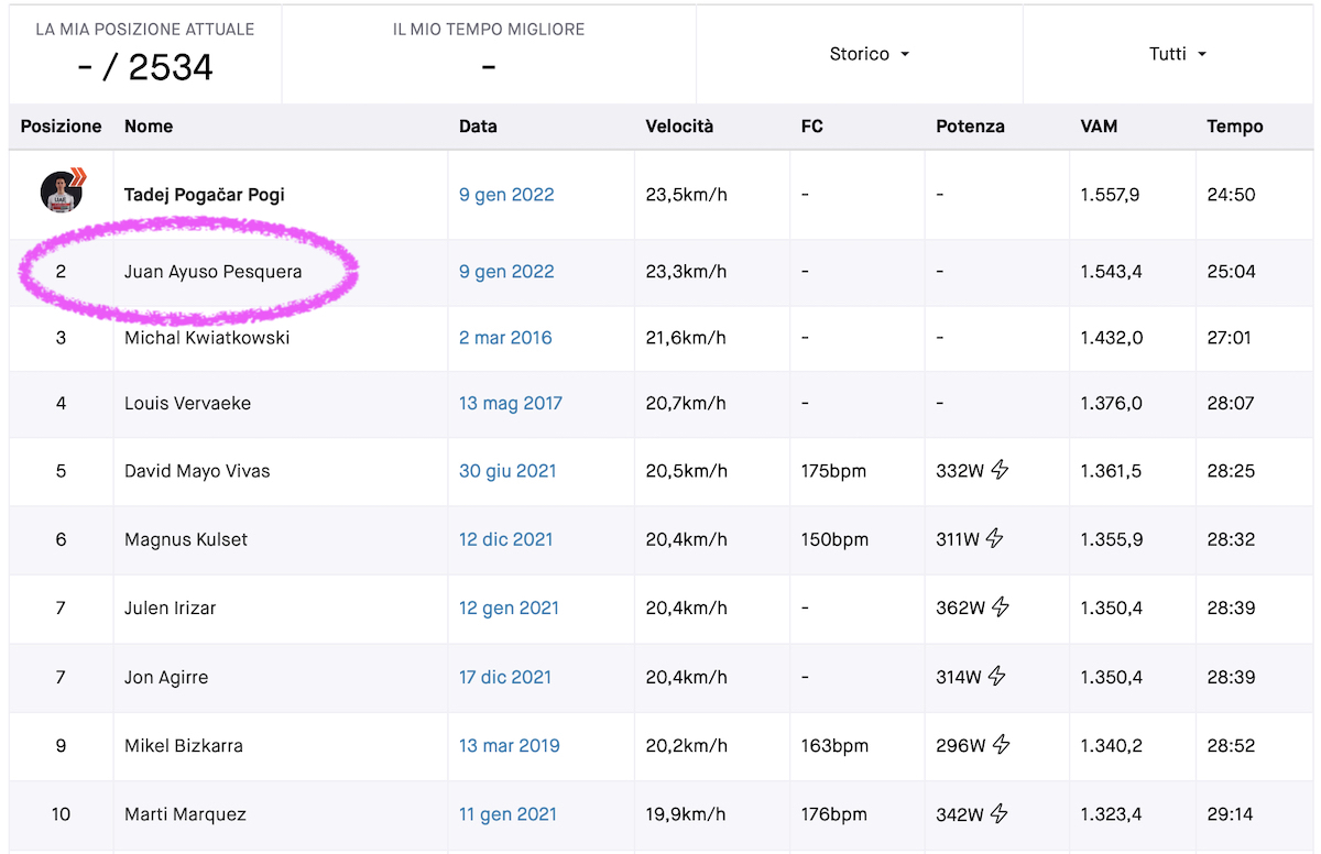 Ma andando oltre i numeri, la nostra attenzione è stata attirata da un'altra cosa, ovvero su chi quel giorno ha ottenuto il secondo tempo di scalata...