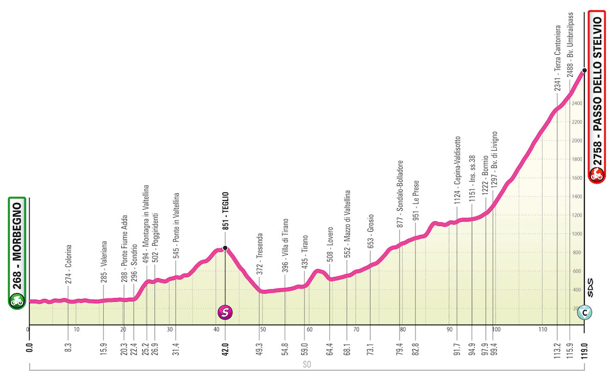Tappa breve ma molto dura, che designerà la prima bozza, potenzialmente definitiva, della classifica generale. Da Morbegno si segue il corso dell’Adda fino a Sondrio dove si sale sulla strada panoramica attraversando località importanti per il ciclismo come Poggiridenti. Passaggio da Teglio (che da il nome alla valle) e poi lunga risalita fino a Bormio attraverso Tirano, Mazzo di Valtellina e Valdisotto. La salita finale che conduce al Passo dello Stelvio la conosciamo tutti: più di 20 chilometri con oltre il 7% di pendenza media.