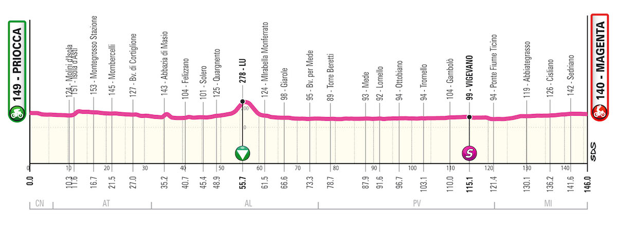 Tappa interamente piatta dedicata alle ruote veloci che avranno come unica difficoltà il breve strappo di Lu. Si attraversa la pianura Padana alessandrina e pavese. Zone sostanzialmente diritte e perfettamente piatte. Arrivo in volata quasi certo.