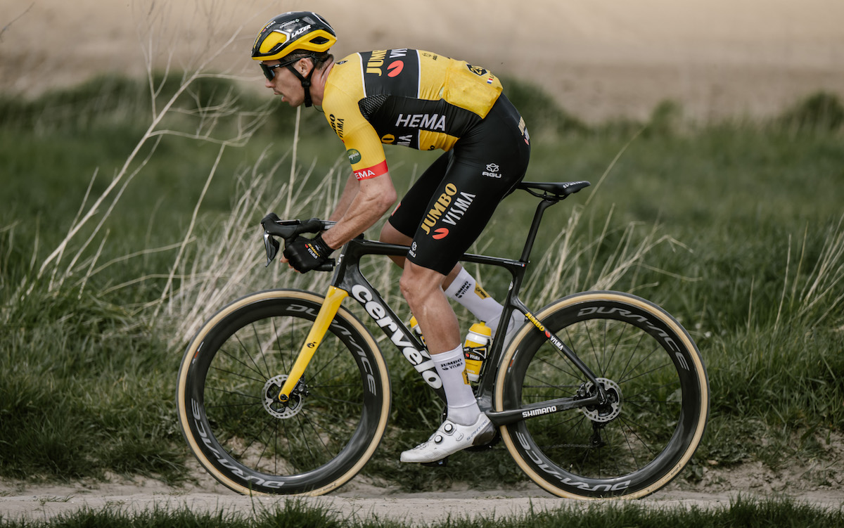 Stessa squadra (Jumbo-Visma), stessa dinamica, identico allestimento: tubolare con carcassa A Dugast (utilizzato nel ciclocross) con battistrada ad uso stradale Vittoria (A Dugast è marchio di proprietà Vittoria), montato su ruote Shimano Dura-Ace 9100.