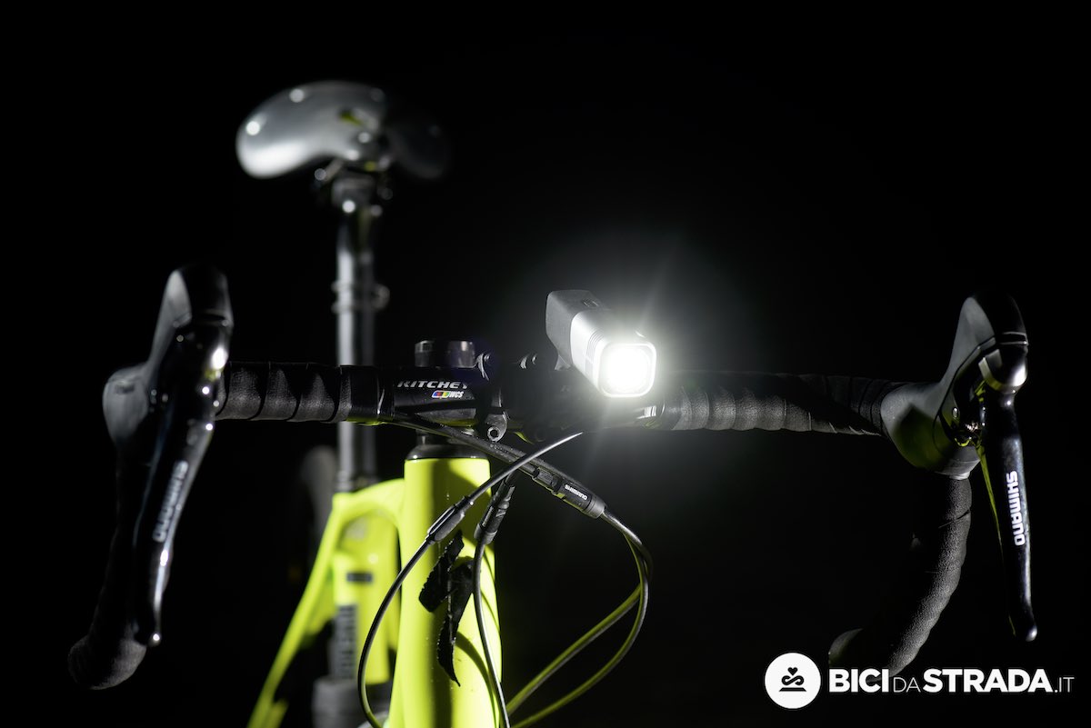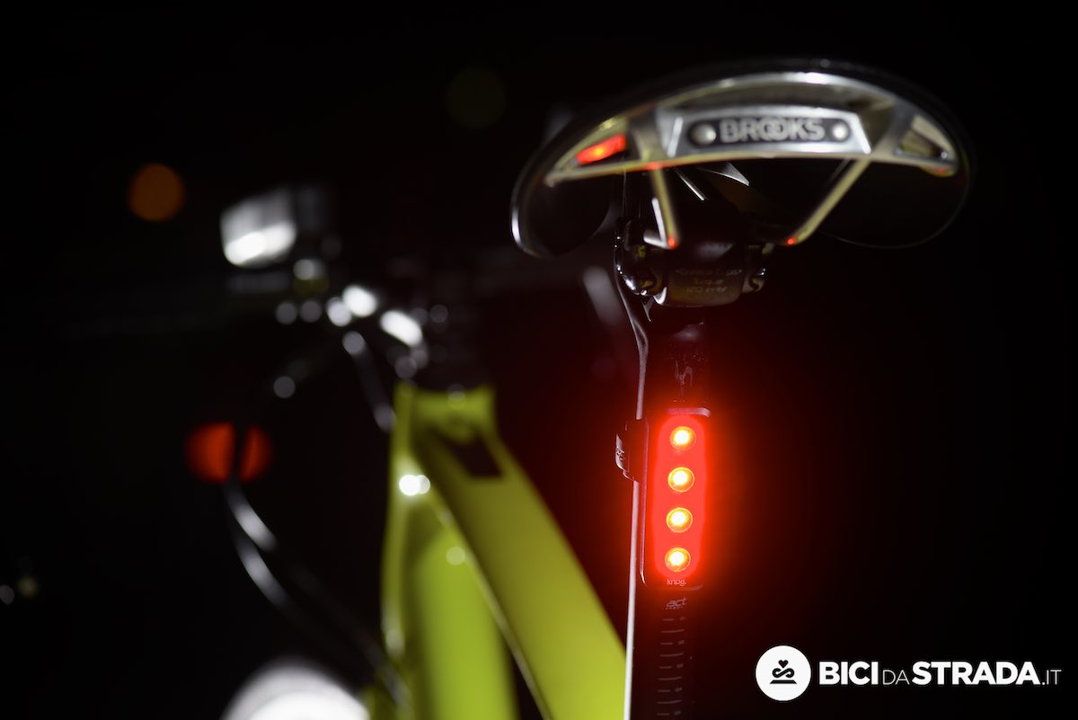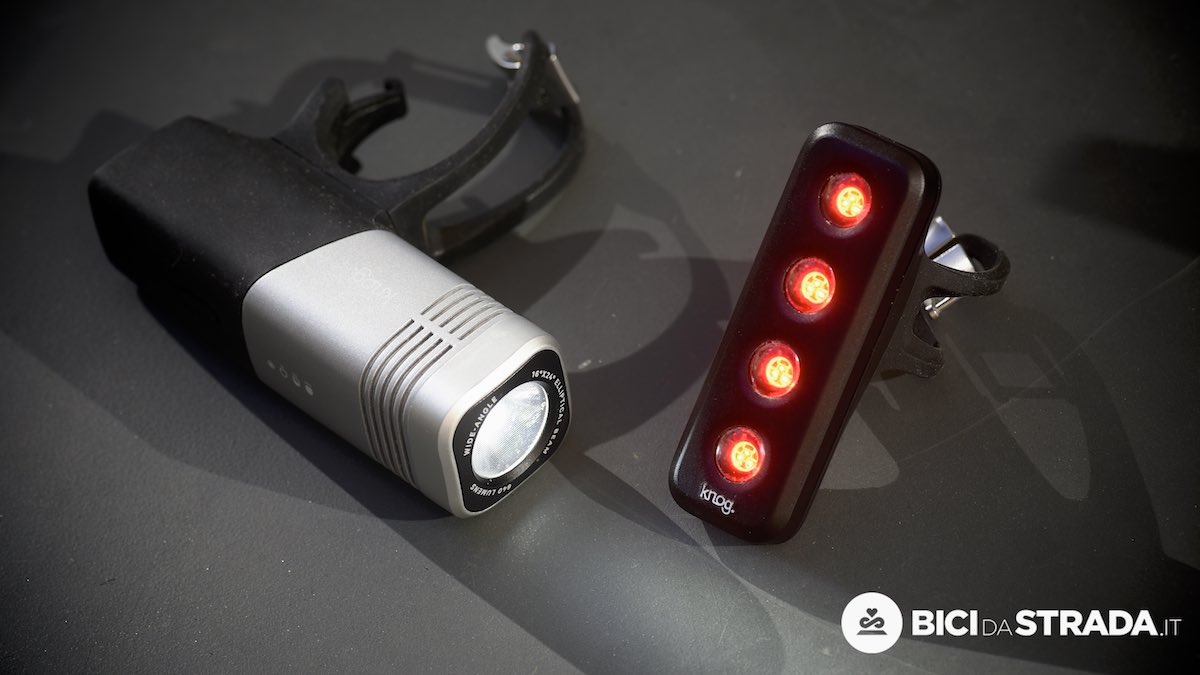 Un kit luci led con batterie ricaricabili integrata della Knog (qui il test). Quella frontale è indicata soprattutto per le uscite notturne.