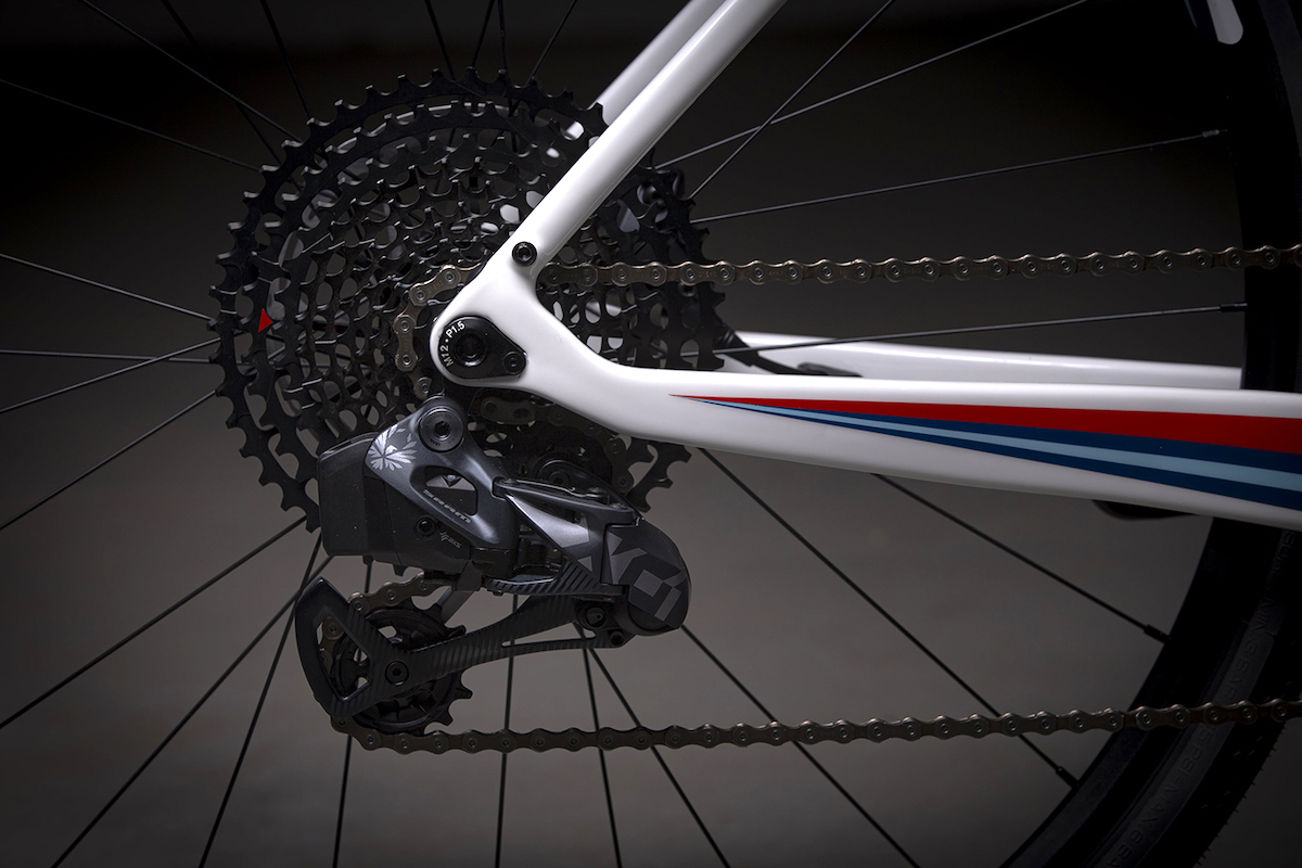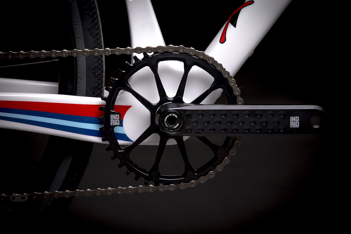 Tra questi troviamo la guarnitura monocorona da 42 denti e un pacco pignoni 12v con scala rapporti 10/48, realizzati da Ingrid, e le ruote a 28 raggi, con canale da 23mm assemblate a mano da Cyp Wheels.