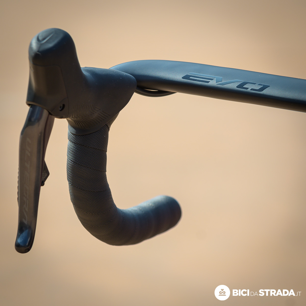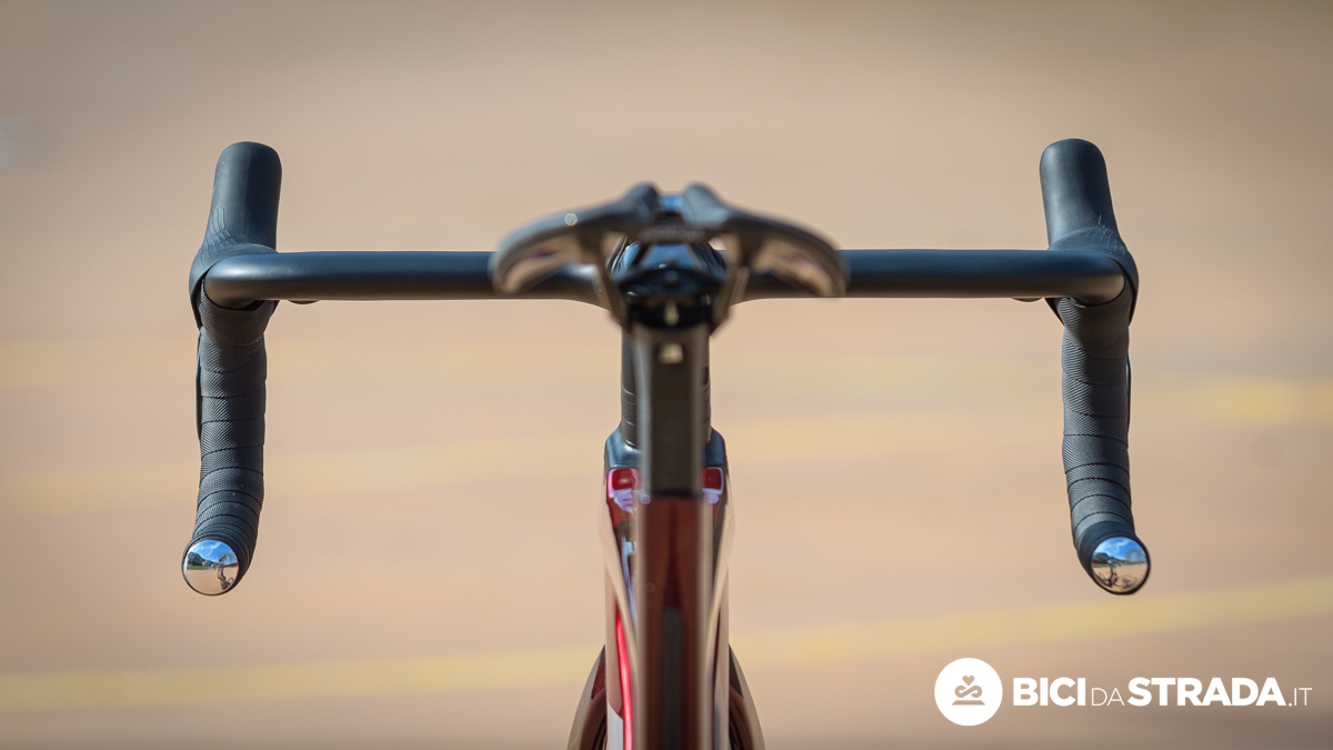ll manubrio proprietario integrato BH Aero ACR in fibra di carbonio presenta una leggera apertura dei terminali della curva (angolo esterno o outsweep).