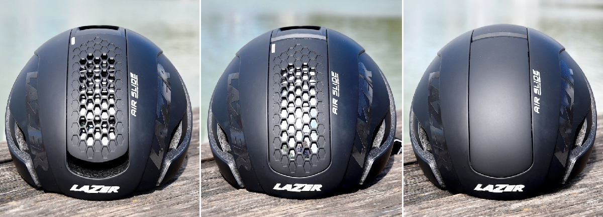 Da sinistra, il casco Lazer Bullet 2.0 con Airslide aperto, con Airslide chiuso e con cover completamente chiusa.