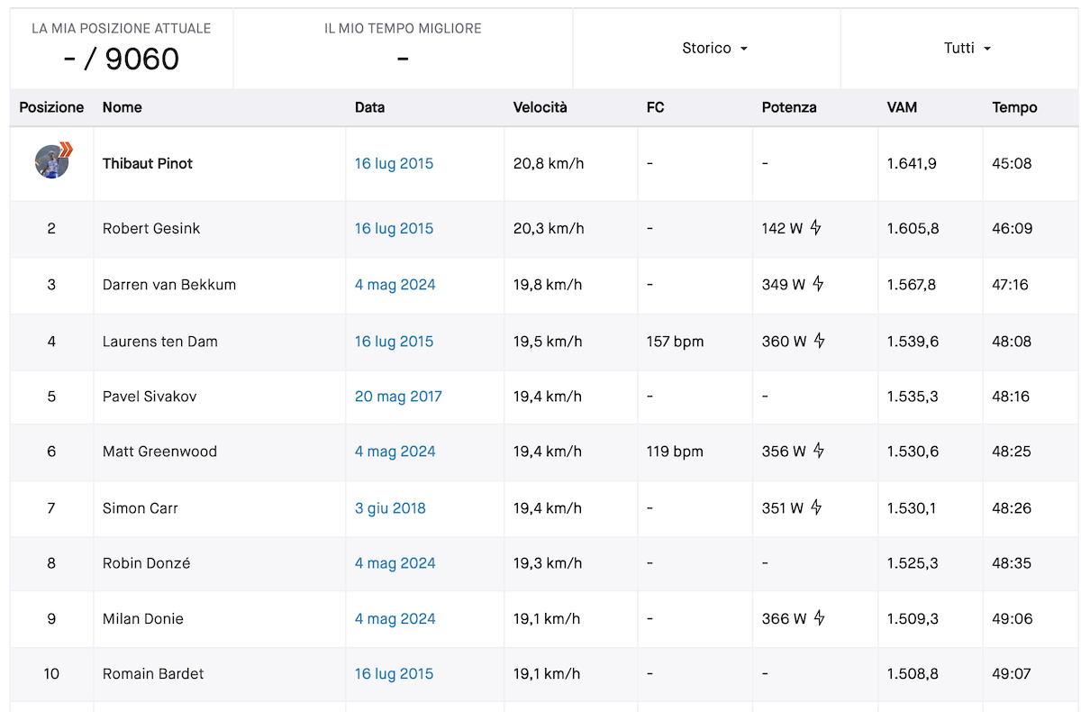 Il KOM sul segmento Strava del Tour de France (che però misura circa 200 mt in meno rispetto all’altimetria ufficiale) è di Thibaut Pinot. Il francese lo ha fatto registrare nel 2015, in una frazione corsa sotto la pioggia e vinta da Purito Rodriguez con una fuga da lontano. Nel gruppo dei migliori, insieme a Pinot, c’erano anche Froome, Quintana, Valverde, Contador, Thomas, Van Garderen, Rolland e Nibali. Insomma, quasi tutti i migliori della “vecchia generazione”.