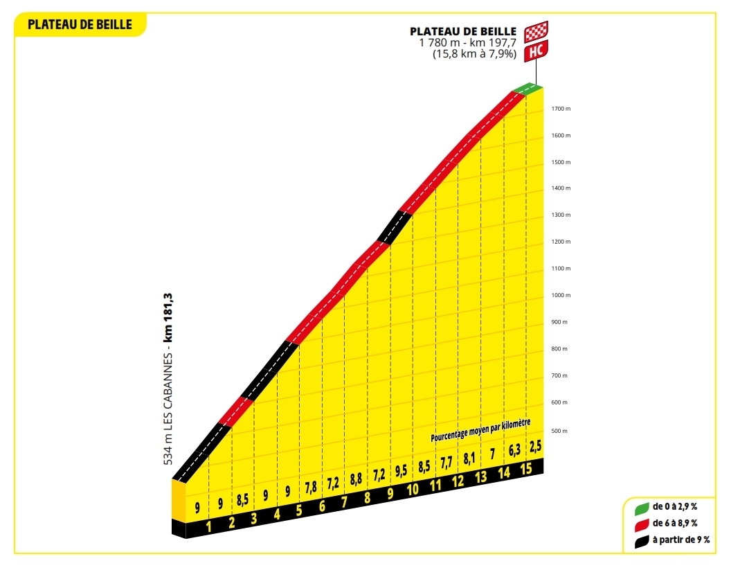 Plateau de Beille è una classica salita Pirenaica, caratterizzata da lunghi rettilinei e da pendenze costanti. Non ci sono muri proibitivi, ma neanche tratti di respiro. Ed è molto lunga. I numeri dicono 15,8 km, con 1.245 metri di dislivello e una pendenza media del 7,9%.