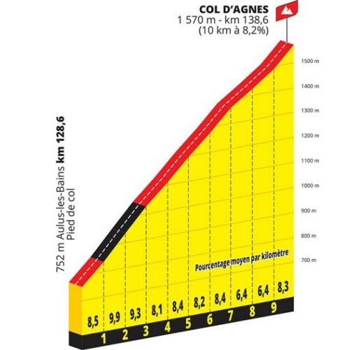 L’esperienza degli ultimi anni ci ha mostrato che si tratta della pendenza ideale dove fare la differenza, perché chi ha gambe può fare velocità. Potenzialmente, vista la quota non troppo elevata (la vetta è a 1.780 metri slm) può regalarci prestazioni da record in termini di watt e VAM, ma c’è da considerare che sarà la seconda frazione pirenaica consecutiva e che la tappa è dura e lunga…