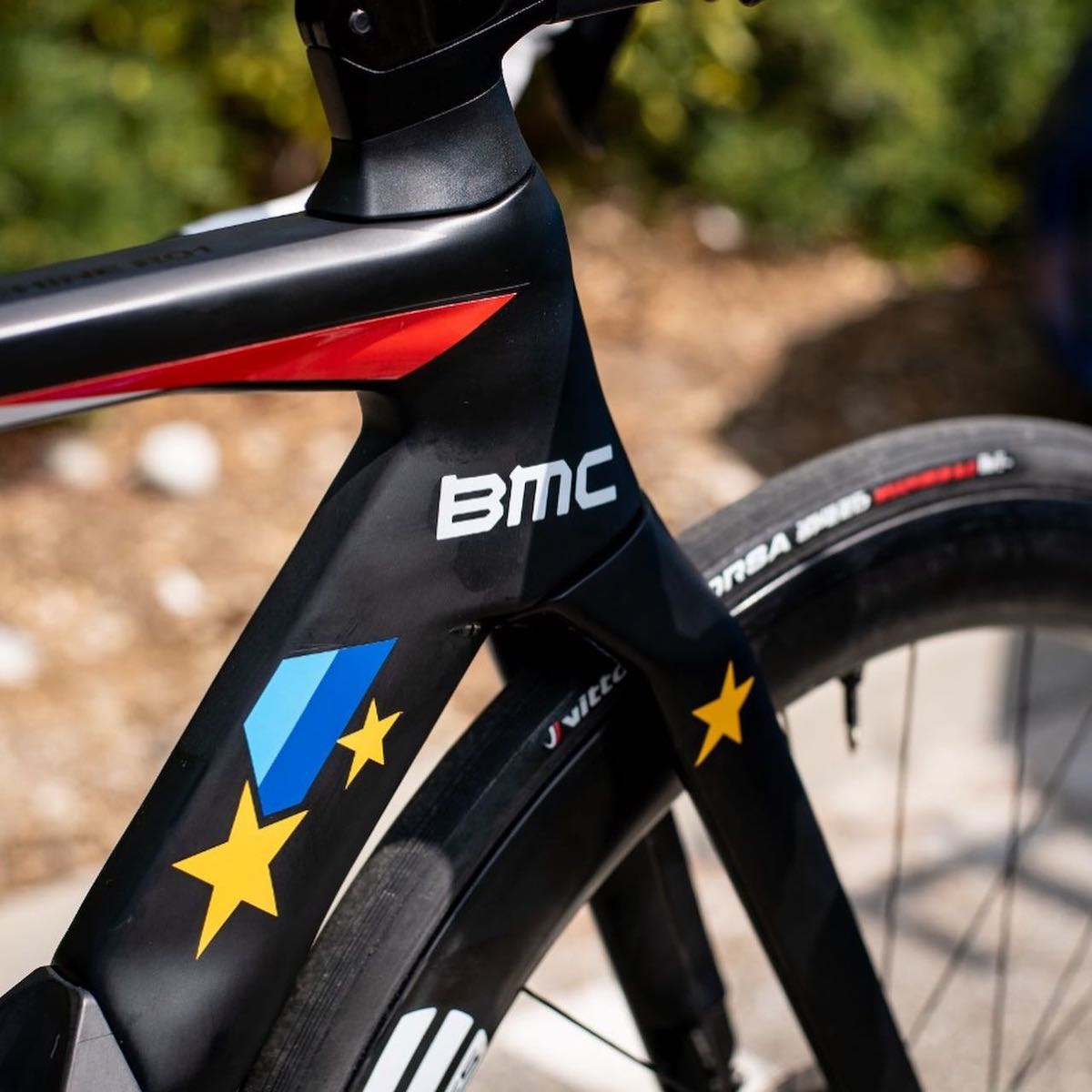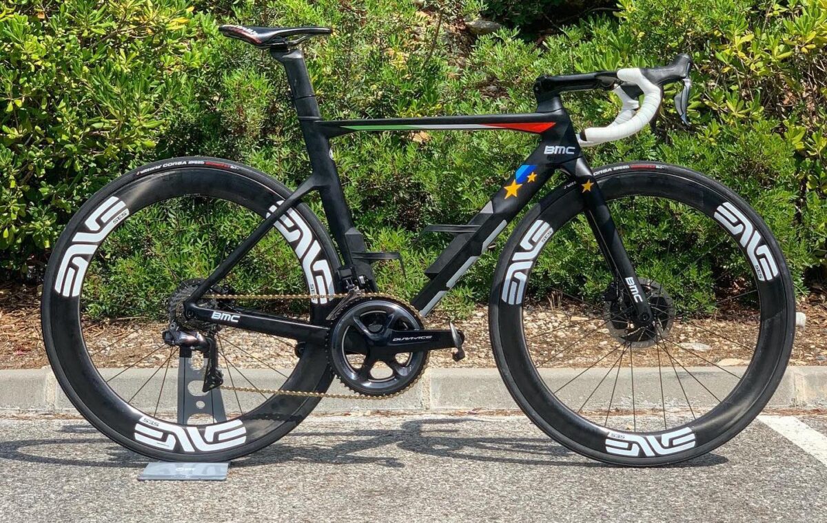 Dopo la conquista delle maglie di campione italiano e di campione europeo, Bmc gli ha preparato una bici personalizzata, che unisce i fregi tricolore (sotto il tubo orizzontale) con le stelle continentali (su forcella e tubo obliquo).