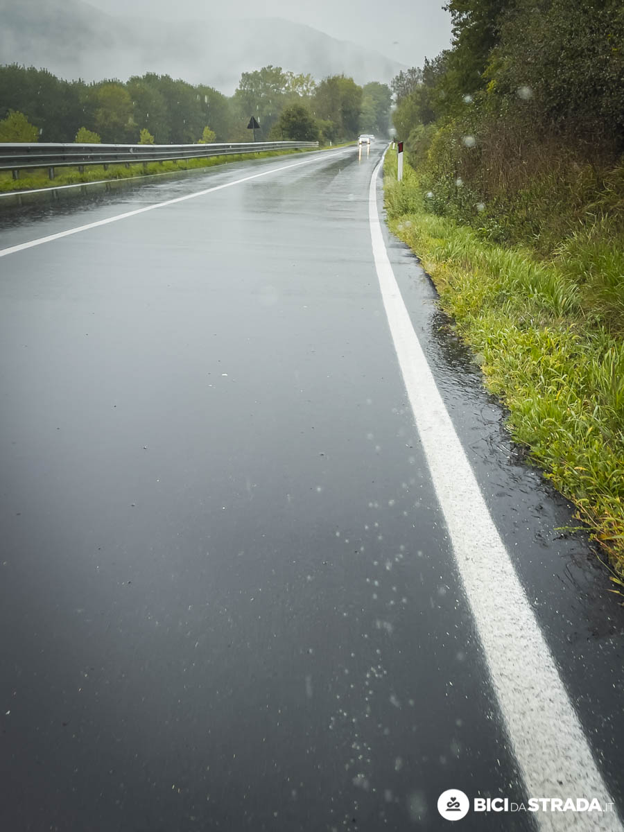 La strada è già bagnata e le gomme più sgonfie di 0,3 bar sono state una scelta di saggezza.