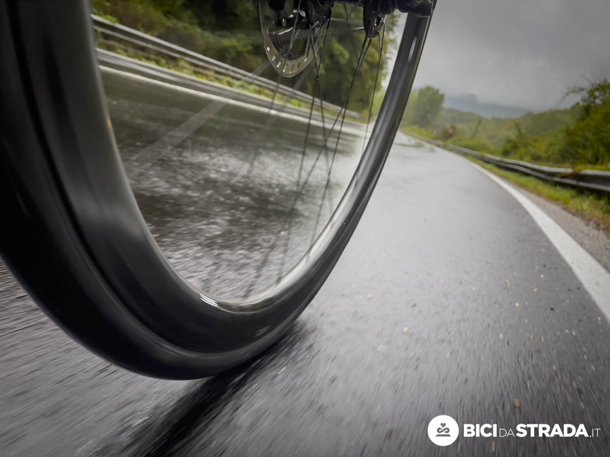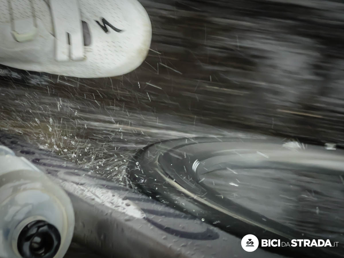 La ruota anteriore solca quello strato d’acqua sull’asfalto.
